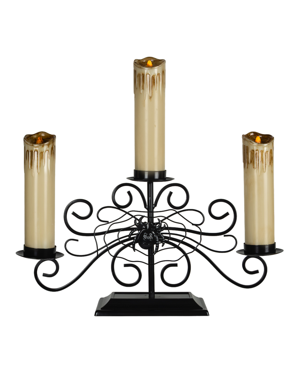 3-armiger Antiker Spinnen Kerzenleuchter mit 3 LED-Kerzen 41 x 44cm Halloween und Gothic Kerzenhalter mit Spinnennetz und Spinne Der 3-armige Antike Spinnen Kerzenleuchter mit seinen flimmernden LED-Kerzen scheint direkt aus einem düsteren Märchen entsprungen zu sein. Wie ein Artefakt aus vergessenen Zeiten thront die große schwarze Spinne im Zentrum, ihre Arme sorgsam um die leuchtenden Kerzen geschlungen. Der dekorative Kerzenständer besteht aus schwarzem Metall und Kunststoff, die Patina seiner Kerzen in Beige und Braun verleiht ihm einen charmanten Used-Look. Die drei LED-Kerzen imitieren mit ihrem flackernden Licht echten Kerzenschein – ganz ohne Ruß oder Brandgefahr. Das absolute Highlight: die große schwarze Spinne im Zentrum, die neugierige Blicke magisch anzieht. Lieferumfang: 1 x 3-armiger Antiker Spinnen Kerzenleuchter mit 3 LED-Kerzen 41 x 44cm Inhalt: 1 x Kerzenleuchter, 3 x LED-Kerzen Farbe: Schwarz, Beige, Braun Größe: inkl. LED-Kerzen ca. 41 x 44 x 10,5 cm Gewicht: 920 g Batterien: Es werden 6 x AA-Batterien benötigt, nicht inkl. Material: Metall, Kunststoff Extravaganter Spinnen Kerzenständer mit LED-Stumpenkerzen, deren Licht flackert In der Mitte des Kerzenständers befindet sich als Blickfang eine fette schwarze Spinne Das antike Vintage Design lässt die Kerzen alt und gebraucht aussehen Durch seine eindrucksvolle Größe ein Blickfang für Tischdekoration, Fensterbrett oder Side Board Außergewöhnliches Wohnaccessoire für Liebhaber von Gothic und Halloween Kuriositäten
