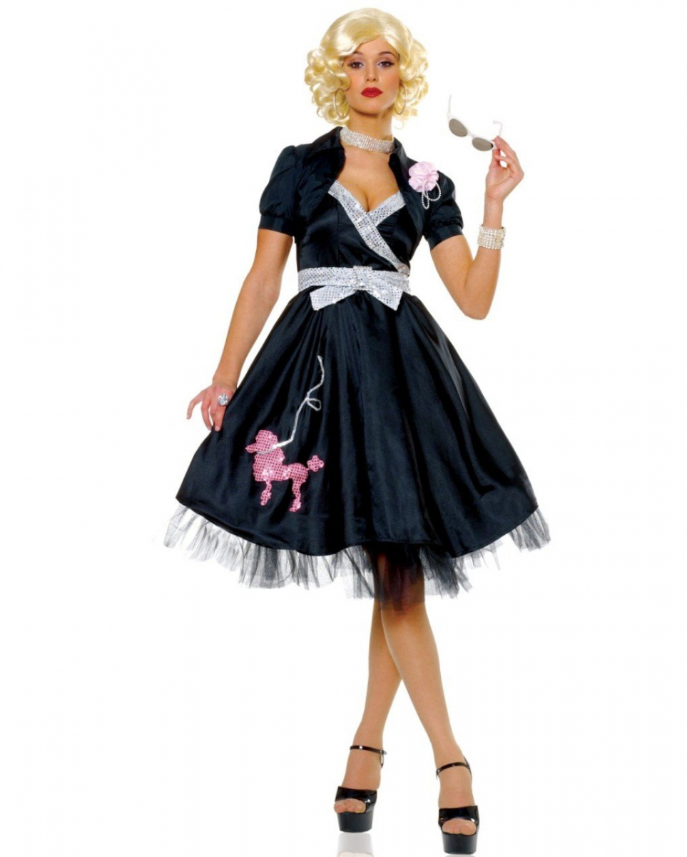 50er Jahre Rock`n Roll Diva Kostüm Stilvolles 50er Jahre Rockabella Kostüm für Karneval und Fasching Verkleide dich im Stil der 50er Jahre und gönne dir dabei das Aussehen einer feine Hollywood Diva. Stars und Sternchen der damaligen Zeit des Rock´n Rolls schwörten auf den Hop Look mit Pudel Motiv als Applikation, Schleifen und Tüll. Unser 50er Jahre Diva Kostüm ist aus Seide ähnlichem Stoff, mit Pailetten verziert und auf der linken Seite ist ein aufgenähter pink farbener Pudel zu sehen. Der angenähte Petticoat Unterrock ist aus Glitzerstoff. Die Träger und der Gürtel sind mit Pailetten verziert und bilden zusammen mit dem ebenfalls im Lieferumfang enthaltenen, schwarzen Bolero Jäckchen, den Abschluss des eleganten 50er Jahre Kostüms. Lieferumfang: 1 x 50er Jahre Diva Kostüm Inhalt: 1 x Schwarzes Trägerkleid mit Pailetten und angenähtem Tüll Unterrock, 1 x schwarzes Bolero Jäckchen, 1 x weiße Kunststoff Perlenkette Größen: S, M, L Material: 100% Polyester