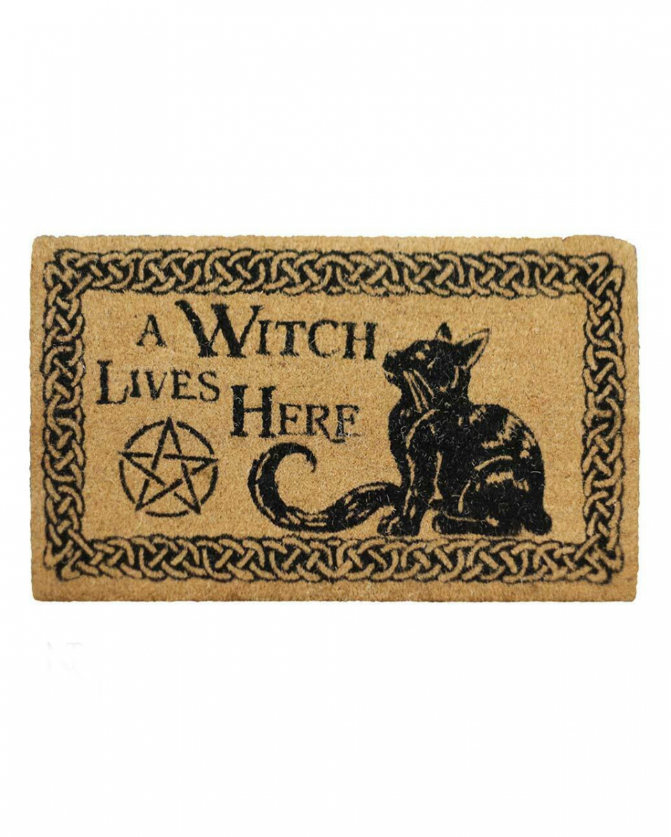 A Witch Lives Here Türmatte Mystische Hexen Fußmatte für ungebetene Besucher Umrandet von einem sich wiederholenden keltischen Muster, trägt die Hexen Fußmatte den Text ",A Witch Lives Here",, mit einem Pentagramm und einer schwarzen Katze. Die Fußmatte mit Pentagramm und Katze eignet sich ideal als Halloween Türdekoration und ist ein mystischer Hinweis für deine Besucher. Unsere stilvolle ",A Witch Lives Here", Fußmatte ist ein robuster Hexen Fußabstreifer aus Kokosfaser. Das Hexen Wohnaccessoire stellt sicher, dass die Welt weiß, dass du einen magischen Schutz besitzt. Da vergeht den Zeugen Jehovas ganz schnell die Lust am Klingeln! Lieferumfang: 1 x A Witch Lives Here Türmatte Farbe: Beige, Schwarz Größe: ca. 45 x 75 cm Material: Kokosfaser Fantastische Türmatte für Halloween und Walpurgisnacht Fans Der Artikel ist ein Dekoartikel für Erwachsene und kein Spielzeug. Nicht für Kinder unter 3 Jahren geeignet. Kann Kleinteile enthalten, die verschluckt werden können – Erstickungsgefahr. Von Feuer und offenen Flammen fernhalten.