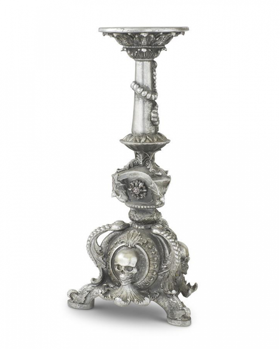 Silberner Altar Kerzenhalter mit Skull und Fledermaus 52cm Edler Gothic Kerzenständer als elegantes Deko Objekt mit aufwendigem Design Der silberne Altar Kerzenhalter mit Skull und Fledermaus ist mit viel Liebe zum Detail gearbeitet und besticht mit einem morbiden Style. Der Sockel ist mit Barock Schnörkeln, die sich zu Schlangenköpfen winden sowie Totenköpfen versehen. Darüber zieren elegante Fledermäuse mit gespreizten Flügeln das eindrucksvolle Deko-Objekt. Der Sockel, der die Kerze oder deine Deko hält, ist darüber zu finden. Der silberne Altar Kerzenhalter mit Skull und Fledermaus 52cm aus hochwertigem Polyresin gegossen und ein Muss für Gothic Fans. Platziere eine Stumpenkerze deiner Wahl oder eine Dekofigur auf dem eleganten Sockel und sorge für mystische Stimmung. Lieferumfang: 1 x Silberner Altar Kerzenhalter mit Skull und Fledermaus 52cm Farbe: Silber Größe: ca. 52 x 24,7 x 24,7 cm Material: Polyresin (Kunststein) eindrucksvolle Halloween Deko mit viel Liebe zum Detail Gegossen aus hochwertigem Polyresin