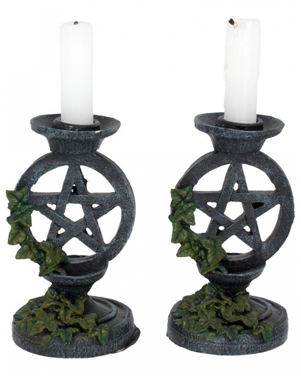 Altertümliche Kerzenständer mit Pentagramm Design Mystisches Gothic Wohnaccessoire für ein stimmungsvolles Ambiente Du bekommst altertümliche Kerzenständer mit Pentagramm Design als mystische Gothic Deko. Die Kunststein Kerzenhalter mit Efeu sind ein dekorativer Blickfang am Esstisch und im Schlafzimmer.   Hol dir 2 altertümliche Kerzenständer mit Pentagramm Design und sorge für lauschiges Kerzenlicht. (Kerzen nicht inklusive) Als Halloween Deko oder Geschenkidee für Mystiker sind diese Leuchter das perfekte Dekoelement. Lieferumfang: 1 x Altertümliche Kerzenständer mit Pentagramm Design Inhalt: 2 Stück Farbe: Grau, Grün, Schwarz Größe: ca. 13,4 cm Material: Polyresin (Kunststein) Zwei Gothic Kerzenständer mit Pentagramm und Efeu als Motiv Dekorative Wicca Tischdekoration für den okkulten Lifestyle Eindrucksvolle Deko für Halloween und Walpurgisnacht Aus hochwertigem Polyresin gegossen Von Hand bemalt Kerzen nicht inkl. Der Artikel ist ein Dekoartikel. Nicht für Kinder unter 3 Jahren geeignet. Kann Kleinteile enthalten, die verschluckt werden können – Erstickungsgefahr. Von Feuer und offenen Flammen fernhalten.