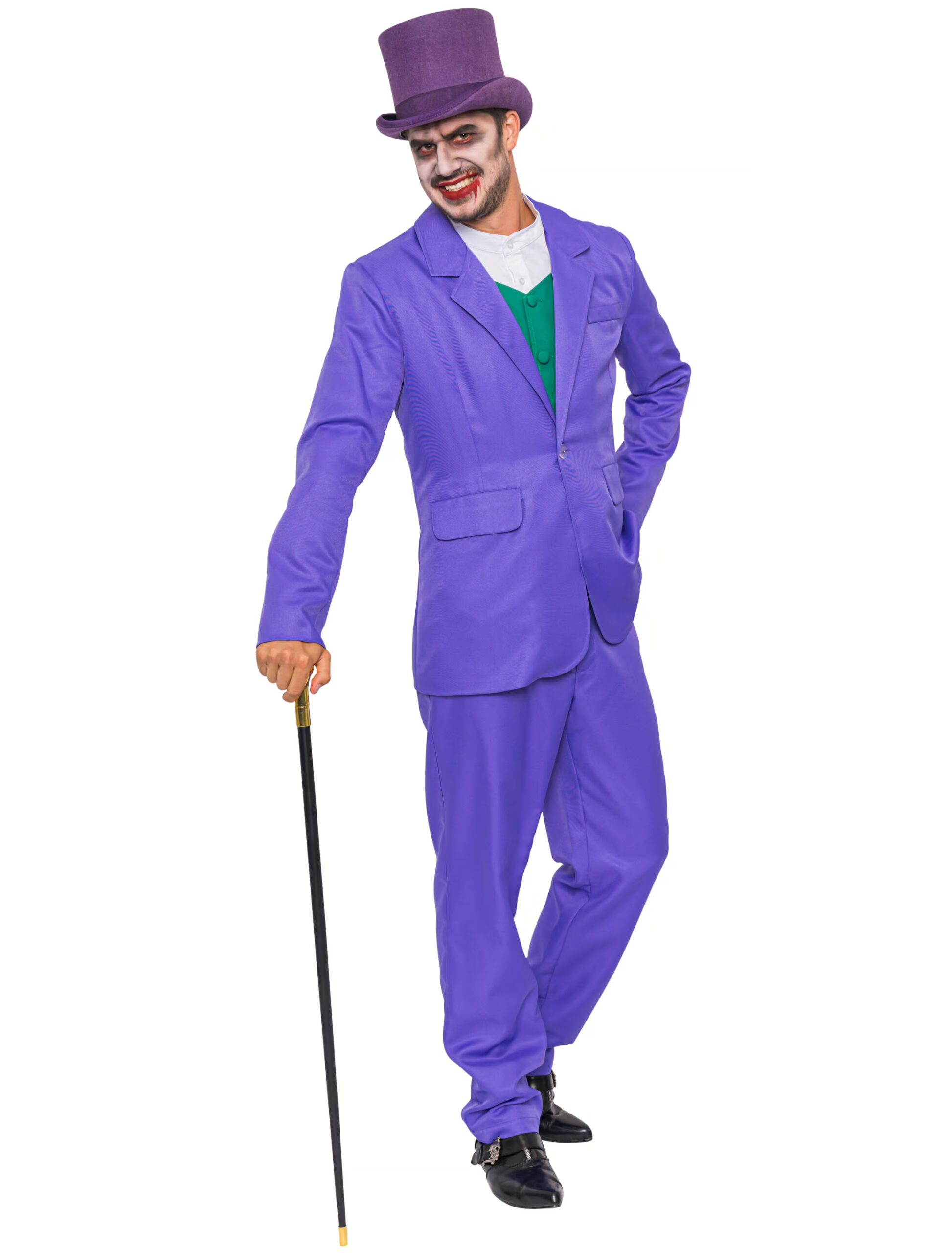 Immer lächelnd und zuvorkommend sowie perfekt gekleidet, so präsentiert sich ein gerissener Schurke, der nicht nur seine Feinde, sondern auch seine Freunde skrupellos über den Tisch zieht und ihre gutgläubigen Frauen mit geheucheltem Interesse, geschickt um den Finger wickelt. Mit diesem schicken, zweiteiligen, lila Herrenanzug kannst Du auf Mottopartys und Kostümfesten in die Rolle des Schurken schlüpfen und der närrischen Welt Deine dunkle Seite zeigen. Der Anzug besteht aus einer langen Hose mit zwei Taschen sowie der hüftlangen, lila Jacke mit schmalem Revers, Einknopfverschluss sowie zwei Taschen und integrierter grüner Weste. Ein farblich passender Zylinder und ein Flanierstöckchen aus unserem Shop machen Deinen Schurkenauftritt unvergesslich.