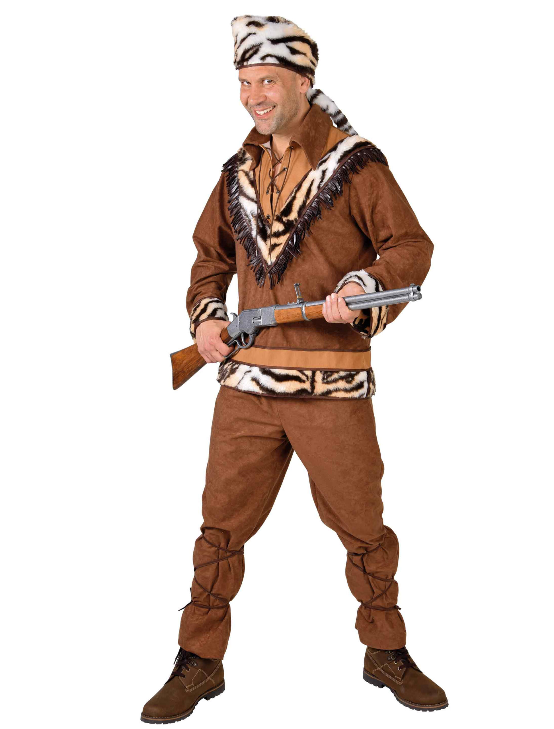 Für wilde Abenteuer sorgt unser Trapper Kostüm für Herren, mit dem Du die Partyprärie in Deiner Stadt erkunden kannst. Das Oberteil und die Hose im braunen Lederlook machen Dich zu einem wahren Abenteurer, der sich auf die Suche nach fernen Kontinenten macht. Mit der passenden Fellmütze und einem Gewehr kannst Du Dich für den nächsten Karnevalszug bereit machen. Sei gespannt, was Dir beim närrischen Fest vor die Flinte läuft und erlebe ein buntes Treiben bei jedem Faschingsumzug. Die Applikationen im tierischen Tigerlook runden das Outfit für alle Wilderer gekonnt ab. Dschungelcamp Kostüm.