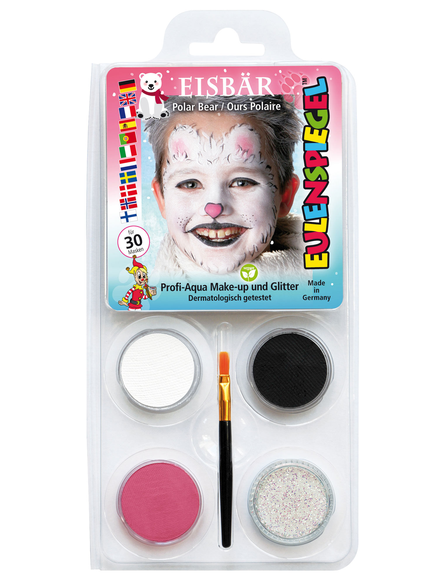 Mit dem Aqua-Set Eisbär wirst Du zum König der Arktis! Mit vier tollen Farben kannst Du aus Dir oder Deinen Freunden einen Eisbären machen. Das Aqua-Set Eisbär besteht aus den Farben Rot, Schwarz und Weiß. Für alle, die es schimmernd mögen, ist auch noch etwas Glitzerstaub enthalten. Dabei kannst Du ganz nach Deinen Vorstellungen malen, deiner Fantasie sind keine Grenzen gesetzt! Damit Du gleich loslegen kannst, ist im Aqua-Set Eisbär auch ein Pinsel enthalten. Die Schminke lässt sich bequem und ohne Rückstände mit Wasser abwaschen. Das Motiv-Set reicht für circa 40 Masken.
