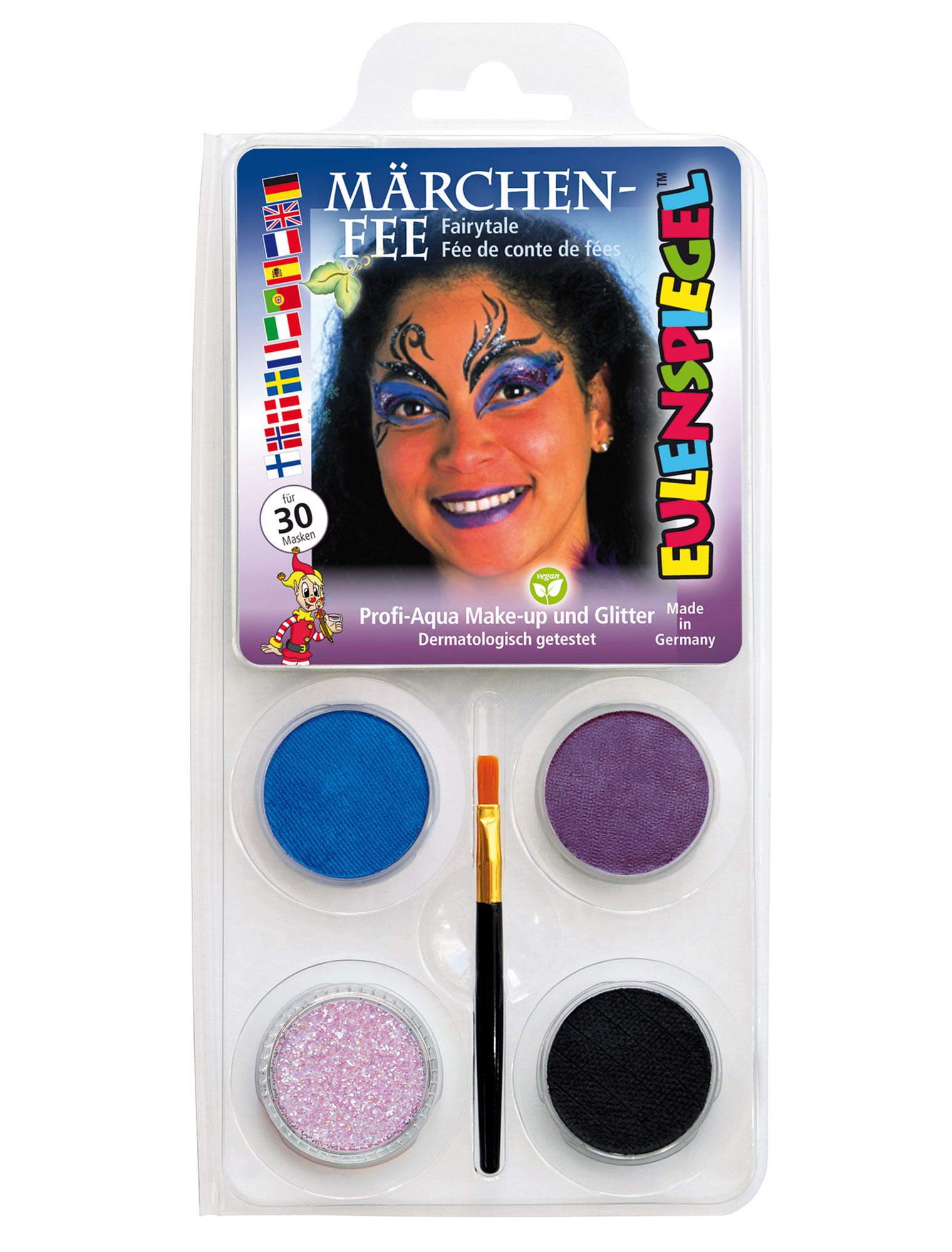 Welches Mädchen träumt nicht davon, einmal als sanfte Fee durch die Gegend zu schweben und mit glitzernden Flügeln alle zu verzaubern? Dieser Traum wird für alle kleinen Mädchen und junggebliebenen Frauen mit dem Aqua-Set Märchenfee Wirklichkeit. Das Set besteht aus vier verschiedenen Farben, die dank des beiliegenden Pinsels leicht auftragbar sind. Die hautfreundlichen Aqua-Farben bieten Dir die Möglichkeit, Deiner Kreativität freien Lauf zu lassen. Glitzernde Ornamente, Blumenranken oder schimmernde Lippen verwandeln Dich im Nu in eine wunderschöne Fee. Das Aqua-Set Märchenfee eignet sich für Jung und Alt und bietet Dir grenzenlose Möglichkeiten. Das Motiv-Set reicht für circa 30 Masken.