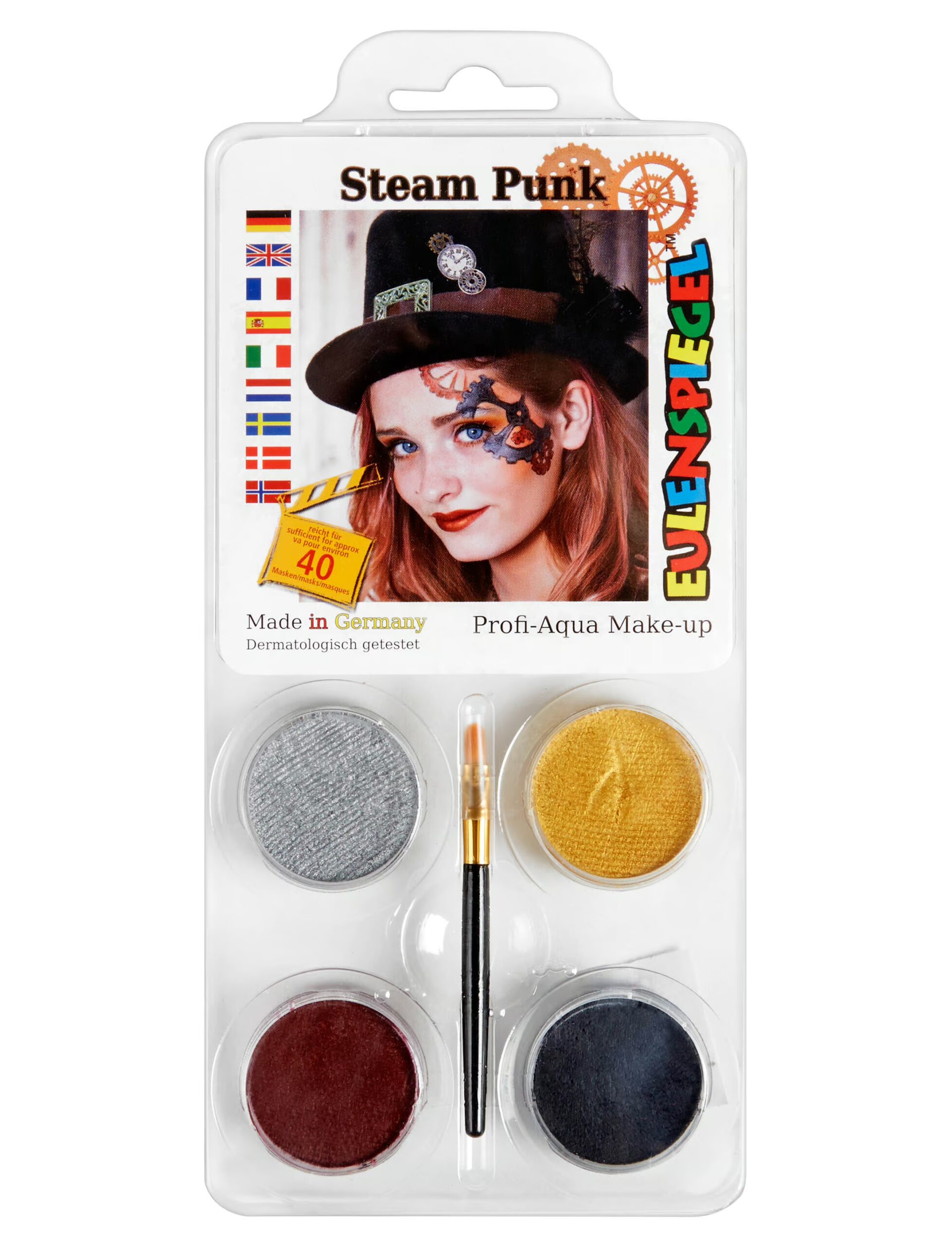 Im Steampunk stehen die Farben Braun und Gold ganz oben auf der Liste. Drum passt es auch hervorragend zu Deinem Kostüm, wenn Du Dir in diesen Tönen Schnörkel und Zahnräder ins Gesicht malst. Das Schminkset, das Du dafür brauchst, bekommst Du natürlich bei uns. Es besteht aus vier Eulenspiegel-Farben, einem Pinsel sowie einer vollständigen Anleitung in Schritt-für-Schritt-Darstellung. Das Motiv-Set beinhaltet die Farben Silber, Gold, Rot, Schwarz und reicht für circa 40 Masken.