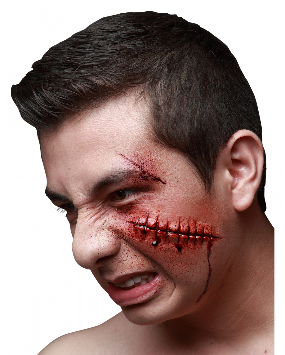 Aufgeplatzte Wunde Halloween Latexwunde Halloween Latexapplikation als Spezial Make-up Zubehör Mit der wirklich gemein aussehenden Latexwunde einer Wunder, der die Fäden zu früh gezogen wurde, ist schnell ein gelungenes Halloween Spezial Make-up geschminkt! Die Aufgeplatzte Wunde Latexwunde kann bei vorsichtigem Gebrauch immer wieder verwendet werden. Latexwunden, wie die bereits vorgeschminkte Latexwunde werden ganz einfach mit Mastix Hautkleber oder Latexmilch, auf die zuvor mit Alkohol gereinigte Haut aufgeklebt. Nach dem Befestigen der Latexapplikation wird diese mit normalem Make-up oder Theaterschminke, dem Hautton der Umgebung angepasst. Zusätzliches Filmblut lassen den Effekt noch um einiges drastischer und sehr realistisch wirken. Nach Gebrauch der Latexapplikation, kann diese ganz einfach wieder von der Haut abgezogen werden. Etwaige Klebereste von Mastix und Latexmilch lassen sich mit Make-up Remover, Nagelackentferner oder mit Seife und warmen Wasser schnell entfernen. Lieferumfang: 1 x Aufgeplatzte Wunde Latexwunde Inhalt: 1 Stück Farbe: Hautfarben/Rot Größe: ca. 16 x 3, 5 cm Material: Latex Bereits vorgefärbt Mehrfach verwendbar Mastix Hautkleber und Filmblut nicht inkl.