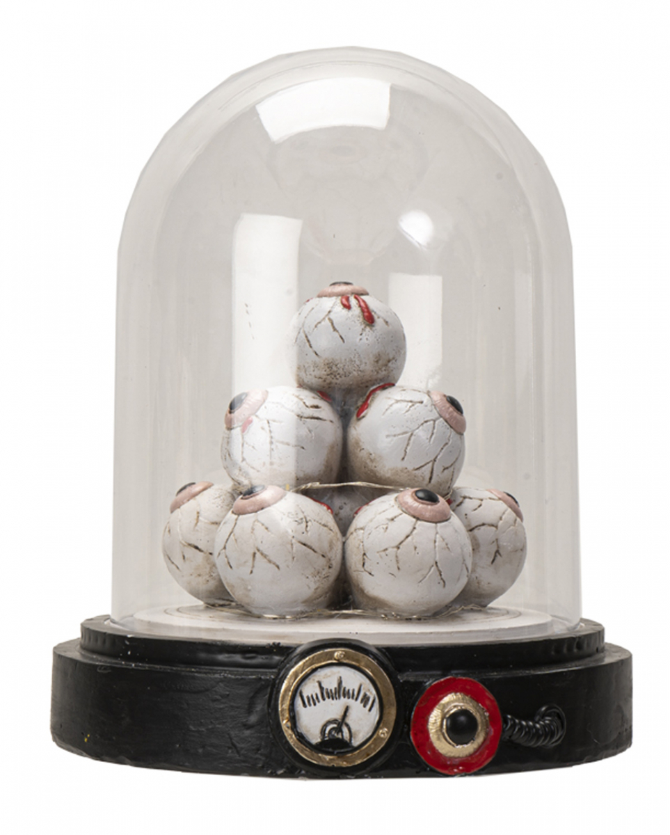 Augenhügel unter Glasglocke mit LED Licht 18cm Aufgetürmte Augäpfel als Horror Deko mit Licht Dieser Turm aus Augäpfeln ist eine gelungene Gruseldeko für Halloween. Der Augenhügel unter Glasglocke mit LED Lichtenthält kleine LEDs, die den Augenberg leuchten lassen. Ein Muss für dein Horror-Labor. Unser Augenhügel unter Glasglocke mit LED-Licht ist eine aus Kunststein gegossene, handbemalte Grusel-Deko mit Augäpfeln. Die Beleuchtung gelingt mit Batterien, die separat erhältlich sind. Lieferumfang: 1 x Augenhügel unter Glasglocke mit LED Licht 18cm Farbe: Weiß, Schwarz, Rot, Gold Größe: ca. 18 x 16 x 14,5 Batterien: Es werden 2 AA-Batterien benötigt, nicht inkl. Material: Polyresin (Kunststein), Glas, Elektronik Augapfel Turm als Grusel Dekoration Glotzende Augäpfel als Ausstellungsstück Horror Deko mit Licht Batterien gesondert erhältlich Der Artikel ist ein Dekorationsartikel. Von Feuer und offenen Flammen fernhalten.