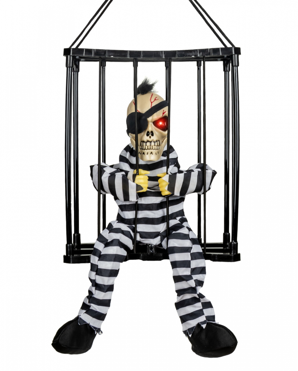Ausbrechender Skelett-Häftling im Käfig mit Licht und Sound 28cm Extrem lustige Halloween Animatronic zum Aufhängen als Grusel-Dekoration Der im Käfig sitzende Skelett-Häftling im Sträflingsanzug und Augenklappe, wird durch Bewegungsmelder aktiv. Er flucht nach dem Auslösen vor sich hin, bevor es voller Ehrgeiz die Gitterstäbe auseinanderreißt und versucht auszubrechen. Der durch die Stäbe gestreckte Kopf plappert munter weiter vor sich hin, während die roten LED-Auge gefährlich aufblitzen. Unser ausbrechende Skelett-Häftling im Käfig ist eine grandiose Halloween Animatronic, die auch unter dem Jahr immer wieder für Stimmung sorgt. Die witzige Halloween-Dekoration des ausbrechenden Skeletts im Käfig ist perfekt zum Aufhängen. Es ist ca. 28 x 23 x 11 cm groß, regiert auf Bewegung. Es wird mit 3 x AA-Batterien betrieben, diese sind nicht inkl. Bestelle mit dem ausbrechenden Skelett im Käfig jetzt eine der lustigsten Halloween Animatronics der letzten Jahre. Lieferumfang: 1 x Ausbrechender Skelett-Häftling im Käfig mit Licht und Sound 28cm Farbe: Schwarz/Weiß Größe: ca. 28 x 23 x 11 cm Gewicht: 443 g Batterien: Es werden 3 x AA-Batterien benötigt, nicht inkl. Material: Kunststoff, Stoff Geniale Halloween Animatronic mit Bewegung, Licht und Sound Das ausbrechende Skelett im Sträflingsanzug reagiert auf Bewegung Der im Käfig gefangene Skelett-Häftling spricht, bewegt sich und leuchtet mit den Augen Extrem lustiges Halloween Gimmick, wunderbar als Deko und Geschenk