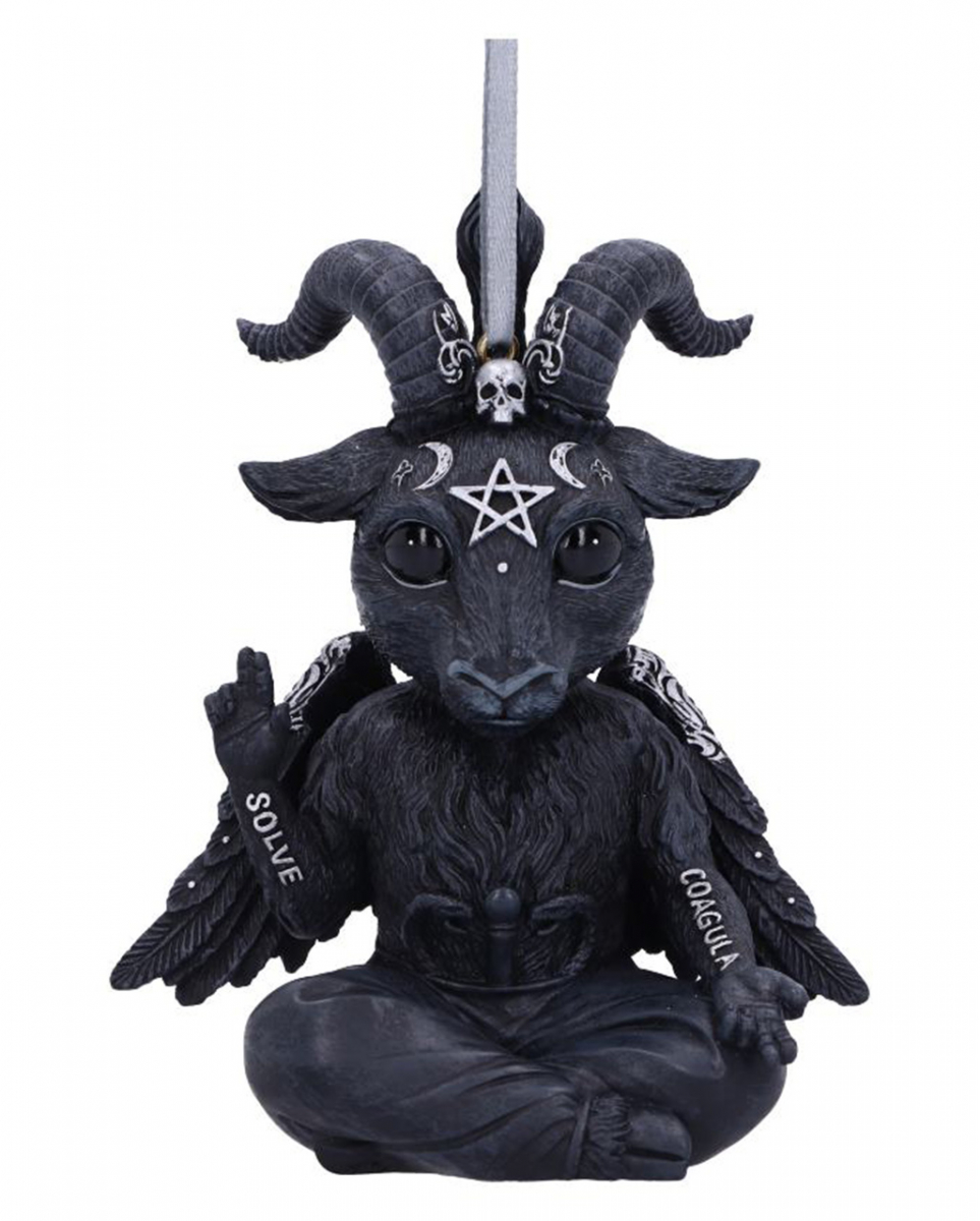Baphoboo Weihnachtsschmuck Ornament 11cm Okkulte Christbaumdeko in Form eines Baphomet Babys Baphoboo Weihnachtsschmuck Ornament zeigt Baphomet – die gehörnte, ziegenähnliche Kreatur. Sein linker Arm ist einladend nach außen gestreckt und auf dem Unterarm ist das Wort COACULA (Zusammenfügen) zu erkennen. Unser Baphoboo Weihnachtsschmuck Ornament besteht aus Kunststein und ist sorgfältig von Hand bemalt. Die okkulte Figur ist etwa 11 cm groß und an einer Schlaufe zum Aufhängen befestigt. Lieferumfang: 1 x Baphoboo Weihnachtsschmuck Ornament 11cm Farbe: Schwarz, Silber Größe: ca. 11 cm Gewicht: 150 g Material: Polyresin (Kunststein) Baphoboo Ornament als Weihnachtsschmuck Sammelfigur aus unserer alternative Gothic Weihnachtskollektion Perfekt als Geschenkartikel für Gothic und Heavy Metal Fans Der Artikel ist ein Dekoartikel. Nicht für Kinder unter 3 Jahren geeignet. Kann Kleinteile enthalten, die verschluckt werden können – Erstickungsgefahr. Von Feuer und offenen Flammen fernhalten.