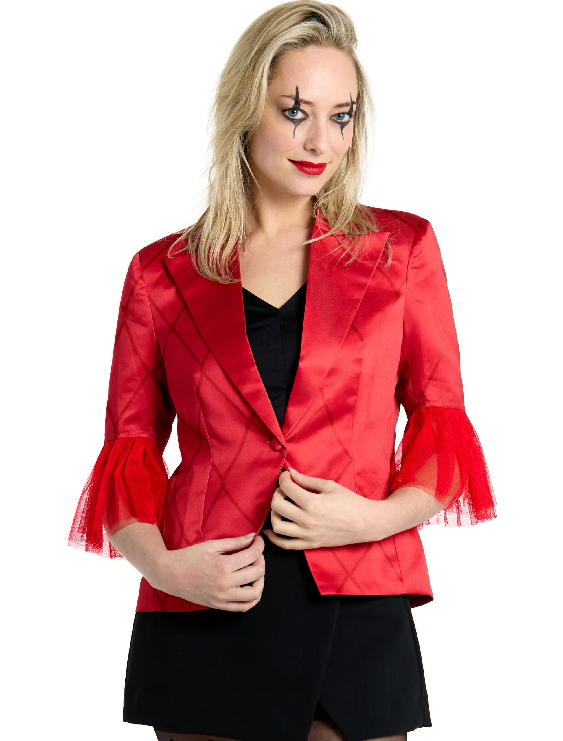 Hey, du Chaos-Queen des Unfugs! Mit unserem Blazer im Harley Quinn Style zeigst du allen, dass du genauso rebellisch bist wie dein Vorbild aus Gotham. Dieses Teil ist nicht nur ein Blazer, sondern eine echte Ansage: knallig, wild und absolut unübersehbar! Sei es auf der Kostümparty, beim Karneval oder einfach, um im Alltag mal ein bisschen Gotham Style reinzubringen. Setz dein frechstes Grinsen auf, schnapp dir ein paar Accessoires, und schon bist du bereit, die Welt ein kleines bisschen wilder zu machen!