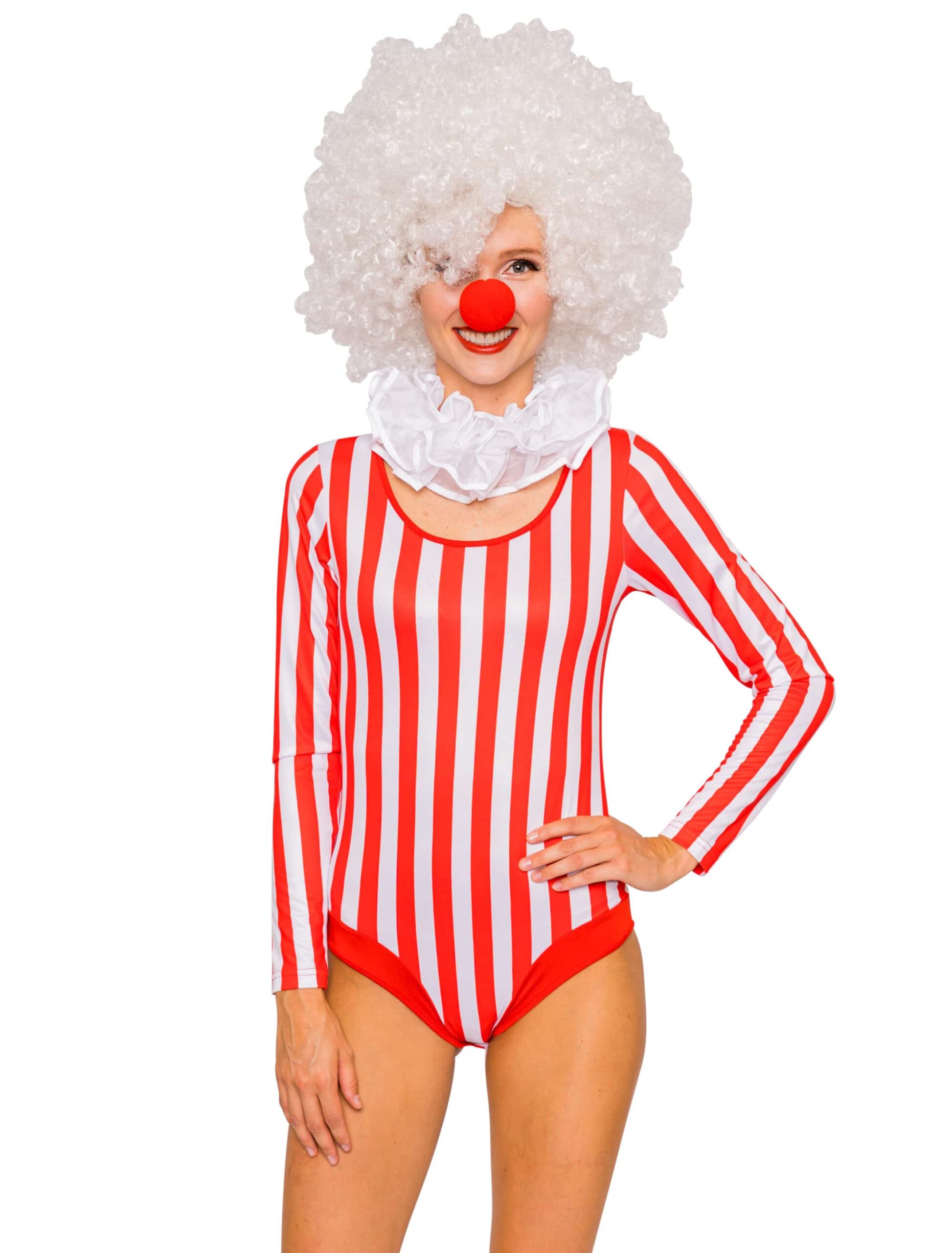Dieser, eher schlichte, dennoch wirkungsvolle, längs gestreifte Body in Rot und Weiß mit den langen Ärmeln und dem Hakenverschluss im Schritt ist ein figurschmeichelndes, angenehm zu tragendes Kleidungsstück aus Polyester und Elasthan, dass Dich mit hübschen Teilen aus unserem Shop und etwas Fantasie zum Hingucker jeder Motto- oder Faschingsparty macht. Mit Perücke und roter Schaumstoffnase bist Du ein bezauberndes Clownmädchen, das die Blicke auf sich zieht und auch als Akrobatin oder temperamentvolle Tänzerin mit Tüllschleppe und High Heels werden Dir die Herzen der Männer zufliegen.