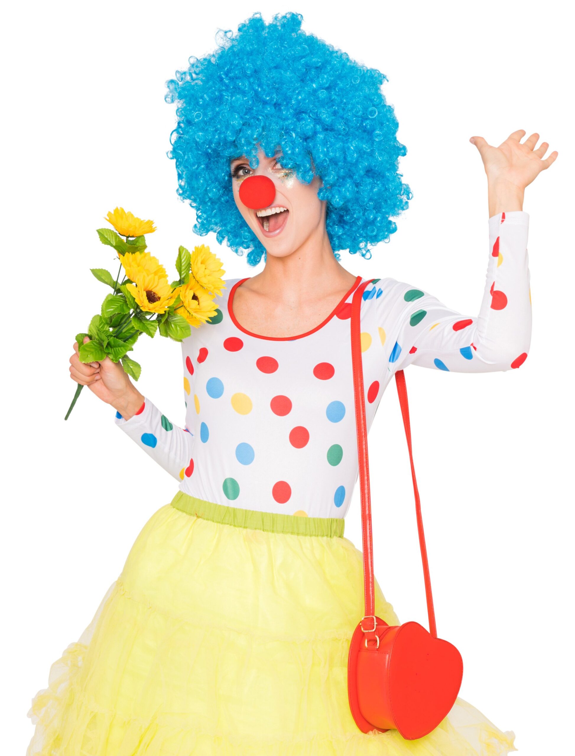 Dieser hübsche weiße Langarmbody mit Hakenverschluss und den schönen, bunten, Punkten ist ein praktisches Basic, das Du sowohl zum aufpeppen Deines Alltagsoutfits als auch für die Kreation von individuellen Karnevals- und FaschingsKostümen universell nutzen kannst. Der ansprechende Body aus Polyester und Elasthan passt sich perfekt Deiner Figur an und bringt Deine Weiblichkeit vorteilhaft zur Geltung. Kombiniere ihn mit einem schicken Tüllrock sowie Perücke und roter Schaumstoffnase aus unserem Shop und werde zum umwerfenden Clownmädchen, das nicht nur die Kinder auf Kindergeburtstagen, sondern auch Erwachsene auf Kostümpartys begeistert.