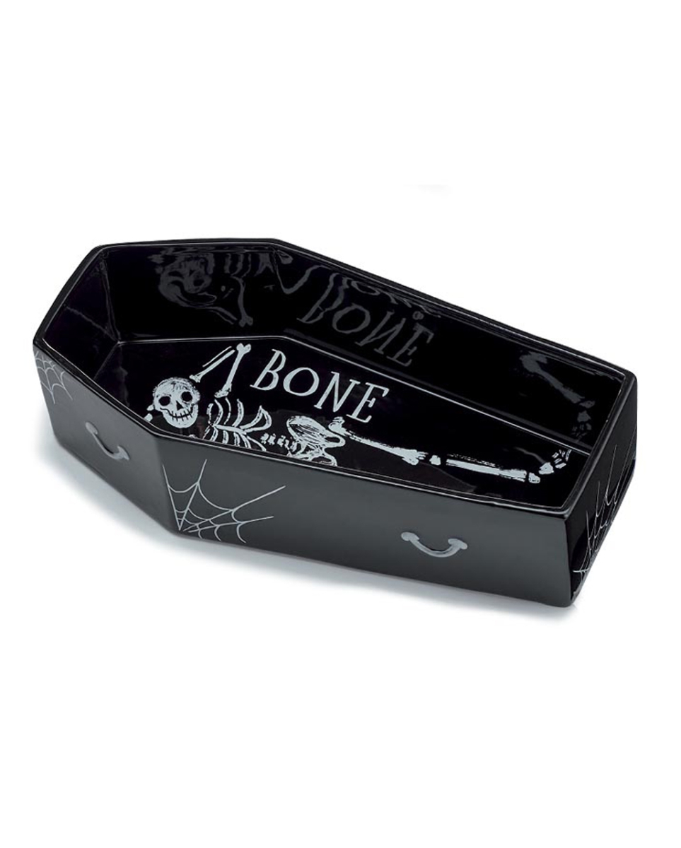 Schwarze ",Bone Appetit Schale", in Sargform als Halloween Geschirr 35cm Schüssel mit Gerippe als Halloween Geschirr fürs Grusel-Buffet Dieses Deko-Element ist eine schwarze Bone Appetit Schale in Sargform als Halloween Geschirr. Stelle die Schale für Halloween Süßigkeiten in dein Horror Buffet und überrasche deine Gäste mit kreativer Deko. Die Halloween Schale misst etwa 35 × 16,6 × 8 cm und ist aus hochwertiger Keramik gefertigt. Der Kontrast-Print ist ein echter Blickfang, der für Gruselstimmung sorgt. Lieferumfang: 1 x Bone Appetit Schüssel in Sargform 35cm Farbe: Schwarz, Weiß Größe: ca. 35 × 16,6 × 8 cm Material: Keramik Schwarze Bone Appetit Schale Im Inneren befindet sich ein weißes Skelett und der Schriftzug „Bone Appetit“ als Motiv Süßigkeiten Schüssel für Halloween Sargschale ist lebensmittelecht, aber nicht für die Mikrowelle und Spülmaschine geeignet