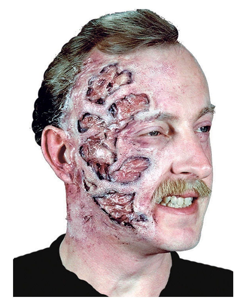 Burn Scar Brandopfer Latexwunde Extremer Spezial Make-up Effekt einer Brandwunde Latexwunde eines Brandopfers, mit über das halbe Gesicht verteilte aufgeplatzten Brandblasen. Mit der Brandopfer Latexwunde als Spezial Make-up Zubehör lassen sich eine extrem realistische Brandwunde darstellen, die vollkommen die linke Gesichtshälfte bedeckt. Mit der großen Latexapplikation als Spezial Make-up schminkst du dich zu Halloween als “Phantom der Oper” oder Freddy Krüger. Die Brandopfer Latexwunde ist eine vorgeschminkte Latexapplikation aus hochwertigem Latex zur realistischen Unfalldarstellung. Diese wird mit Mastix Hautkleber oder Flüssiglatex auf deine Gesichtshälfte montiert. Um Übergänge zu kaschieren und eine bessere Haltbarkeit der großen Fläche zu erreichen, empfiehlt es sich die Ränder mit Flüssiglatex zu überschminken, um dann die fertige Wunde mit Filmblut und Krustenblut zu perfektionieren. Die Brandopfer Wunde lässt sich nach Gebrauch wieder mühelos abziehen und kann immer wieder verwendet werden. Lieferumfang: 1 x Brandopfer Latexwunde Farbe: Hautfarben/Rot Größe: linke Gesichthälfte Material: Latex Hautkleber, Flüssiglatex, Filmblut nicht inkl.