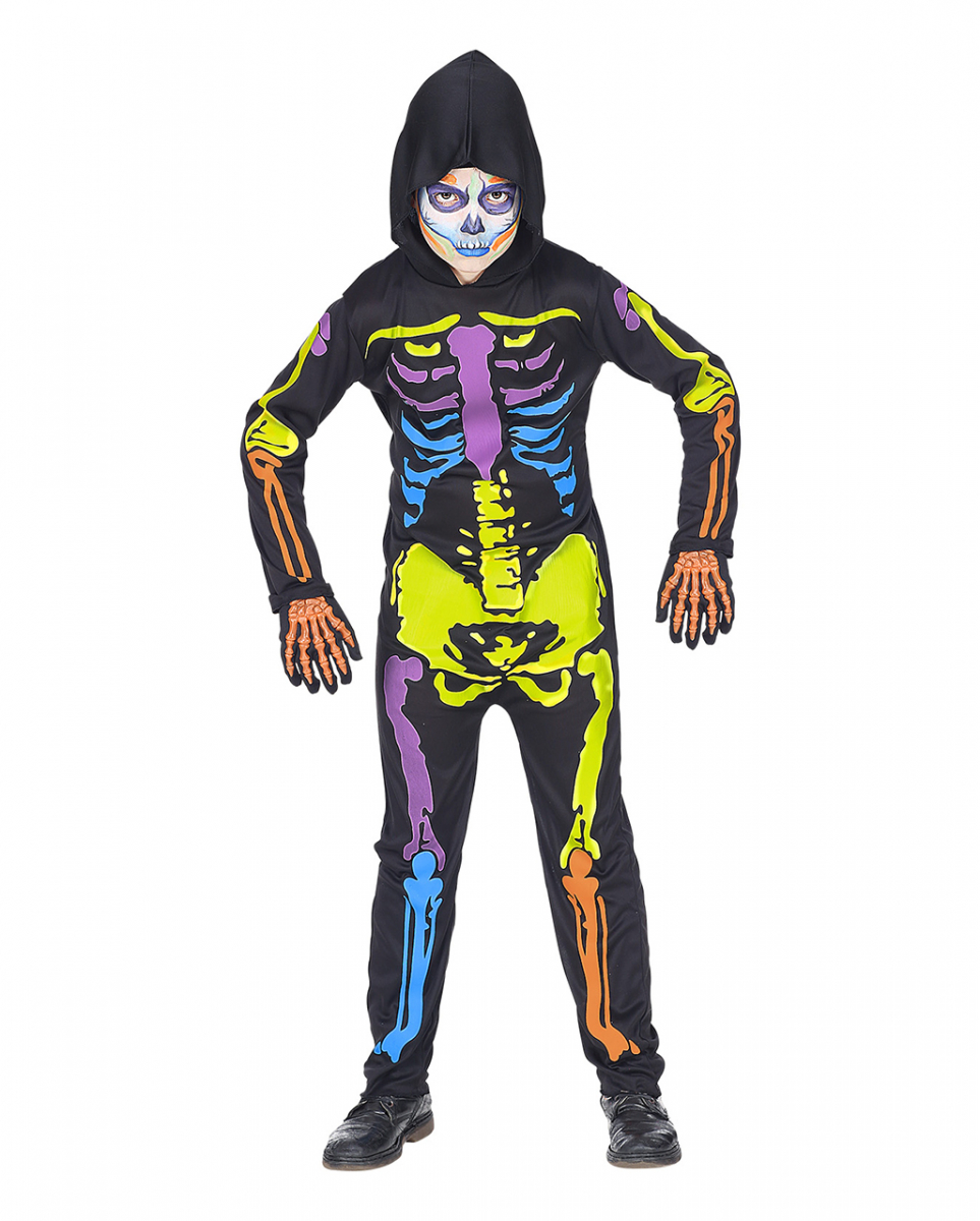 Bunter Skelett Overall für Kinder als Halloween und Karnevals Kostüm Kinder Jumpsuit mit buntem Skelett Aufdruck und Kapuze Mit dem Bunten Skelett Overall für Kinder als Halloween und Karnevals Kostüm fällst du auf jeder Halloween Party auf. Durch die knalligen Farben kann man dich nicht übersehen. Der leichte Stoff ist angenehm zu tragen und hindert dich nicht am ",abzappeln",. Verkleide dich in der gruseligsten Nacht des Jahres mit dem Bunten Skelett Overall für Kinder als Halloween und Karnevals Kostüm. Der Bunte Skelett Overall für Kinder besteht zu 100% aus Polyester. Der Einteiler ist mit auffälliger Farbe bedruckt und hat eine angenähte Kapuze. Das Kostüm ist von 2 Jahre bis 10 Jahre erhältlich und somit für alle Kinder geeignet. Zum Bunten Skelett Overall für Kinder passen Accessoires vom Horror-Shop. Lieferumfang: 1 x Bunter Skelett Overall für Kinder Farbe: Schwarz / Blau / Gelb / Lila / Orange Größe: 2-3, 4-5, 5-7, 8-10 Jahre Material: 100% Polyester Kinder Jumpsuit mit buntem Skelett Aufdruck und Kapuze Als Halloweenkostüm Größe 2-3 Jahre 104 4-5 Jahre 116 5-7 Jahre 128 8-10 Jahre 140