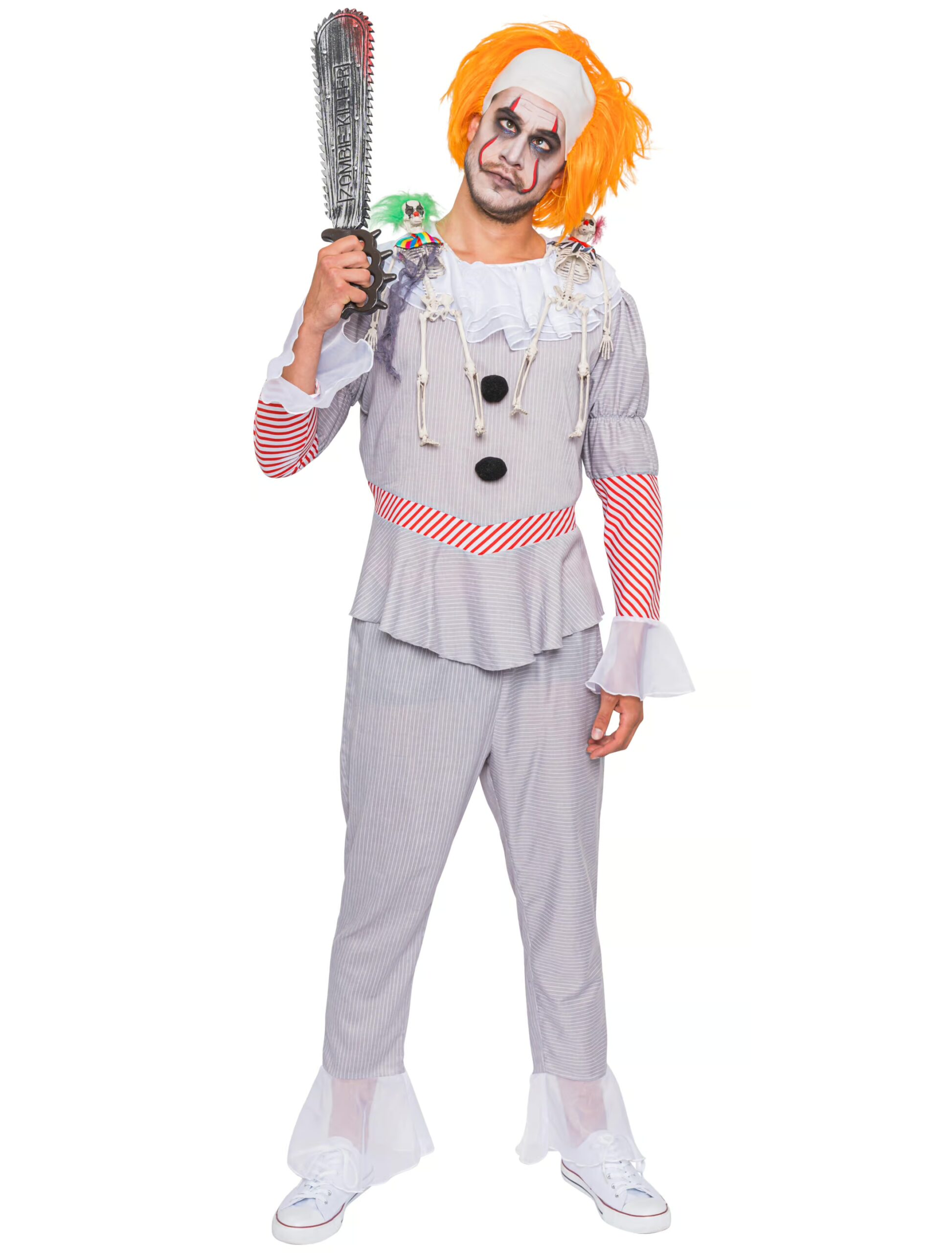 Hast Du mal keine Lust auf einen lustigen, farbenfrohen und lustigen Clown? Dann ist dieses graue Horror Clown Kostüm vielleicht genau das richtige für Dich! Das Kostüm besteht aus einer grau-weiß gestreiften Hose und einem Oberteil mit breiter weiter Halskrause und zwei schwarzen Bommeln. An den Ärmeln und Beinen ist ein Saum mit weißem Tüll. Das Outfit gibt es in verschiedenen Größen gibt. Der Hosenbund ist mit einem breiten Gummizug ausgestattet, der für einen hervorragenden Sitz sorgt. Das Oberteil kann durch einen Knopf am Nacken verschlossen werden.