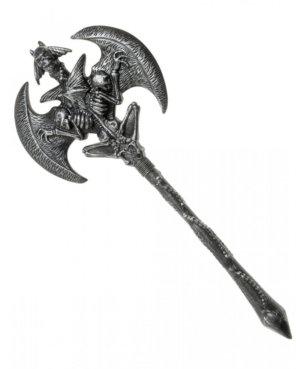 Dämonische Doppelaxt Teuflisch aussehende Mittelalterwaffe als Kostümzubehör und Requisite Die dämonische Doppelaxt als Kostümaccessoire ist die perfekte Horrorwaffe für Dämonen und Barbaren Kostüme. Die Doppelaxt, auch Labrys oder Amazonenaxt genannt, wird seit der mittleren Bronzezeit als Kultgegenstand verwendet und eignet sich daher perfekt für Mittelalter Kostüme. Mit den archaischen Symbolen auf dem Schaft eignet sich die Dämonische Horror Doppelaxt besonders für dunkle Magier und Fieslinge zu Halloween. Die ungefährliche Spielzeugwaffe hat eine Länge von 52 cm und eine Breite von 22 cm, ist mit Skeletten und Dämonenfratzen verziert. Der Griff der Dämonenstreitaxt lässt sich abschrauben. Lieferumfang: Dämonische Horror Doppelaxt Farbe: Silber, Braun, Schwarz Größe: ca. 52 cm x 22 cm Material: Kunststoff