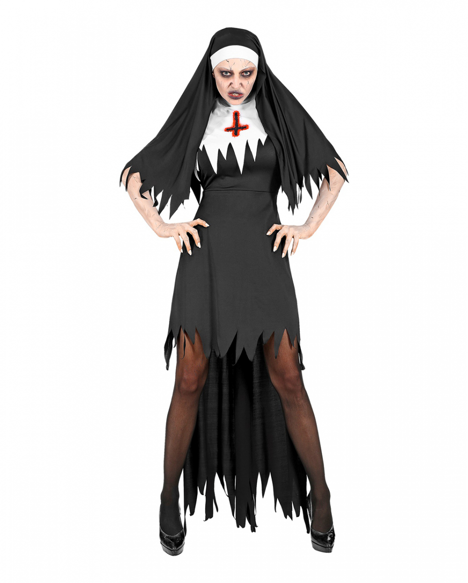 Dämonische Nonne Damenkostüm mit Haube als Verkleidung für Halloween und Fasching Zombiehaftes Killer Nonnenkostüm für Damen Trete als unheilige Ordensschwester in Erscheinung und trage das Dämonische Nonne Damenkostüm mit Haube. Das Halloween Kostüm ist vorne kürzer geschnitten und lenkt den Blick auf deine Beine, die du mit einer Strumpfhose perfekt in Szene setzen kannst. In deinem Paket befindet sich Dämonische Nonne Damenkostüm mit Haube für Erwachsene. Das Horror Nonnen Kostümkleid ist schwarz-weiß gehalten und weist einen gezackten Saum an Haube und Kleid auf. Ein umgedrehtes Kreuz zeigt sich kontrastreich auf dem weißen Latz. Trage dazu ein unheimliches Zombie-Make-up, um den Look perfekt zu machen. Lieferumfang: 1 x Dämonisches Nonne Damenkostüm mit Haube als Verkleidung für Halloween und Fasching Farbe: Schwarz / Weiß Größe: XS,S,M,L Material: 100% Polyester Mit Kleid und Haube Für ein unheimliches Halloween Outfit Größe XS 30/32 S 34/36 M 38/40 L 42/44