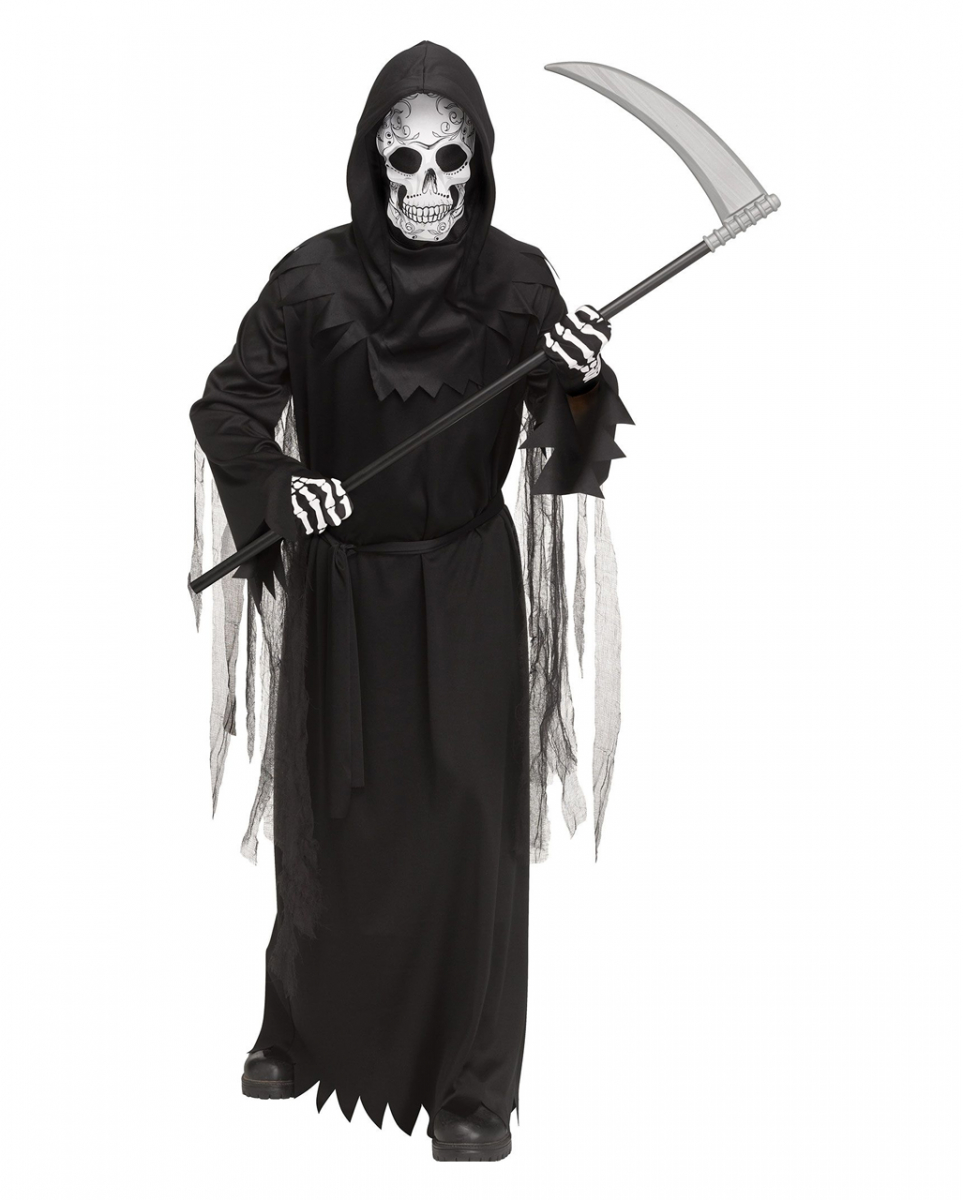 Day of the Dead Sensenmann Kostüm für Kinder an Halloween Unheimliche Grim Reaper Kostümrobe mit Maske, Gürtel und Handschuhen Mit dem Day of the Dead Sensenmann Kostüm für Kinder wirst du zum unheimlichen Hingucker! Tauche ein in die düstere Atmosphäre des Tag der Toten und verzaubere alle mit deinem schaurig-schönen Look. Bist du mutig genug, dieses Kostüm zu tragen? Zum Day of the Dead Sensenmann Kostüm für Kinder gehören die Kostümrobe mit Gürtel, die Handschuhe und die Maske mit Sugar Skull Aufdruck. Die Kapuze verstärkt den gruseligen Effekt. Die Handschuhe sind mit einem Skeletthand Aufdruck versehen. Lieferumfang: 1 x Day of the Dead Sensenmann Kostüm für Kinder Inhalt: 1x Kostümrobe, 1x Maske mit Kapuze, 1x Gürtel, 1 Paar Handschuhe Farbe: Schwarz, Weiß, Grau Größe: M, L Material: 100% Polyester Unheimliche Grim Reaper Verkleidung für den Tag der Toten Bequeme Stoffmaske mit Sugar Skull Aufdruck und Kapuze Gruselige Handschuhe mit Skeletthand Aufdruck Schaurige Fransen an den Ärmeln Sense und Schuhe nicht enthalten Größe M ca. 8-10 Jahre L ca. 12-14 Jahre Brustumfang ca. 69-76 cm ca. 76-81 cm Taillenumfang ca. 58-63 cm ca. 60-66 cm Körpergröße ca. 124-137 cm ca. 139-152 cm Achtung: Der Artikel ist ein Kostüm und kein Spielzeug. Nicht für Kinder unter 3 Jahren geeignet. Kann Kleinteile enthalten, die verschluckt werden können – Erstickungsgefahr. Von Feuer und offenen Flammen fernhalten.