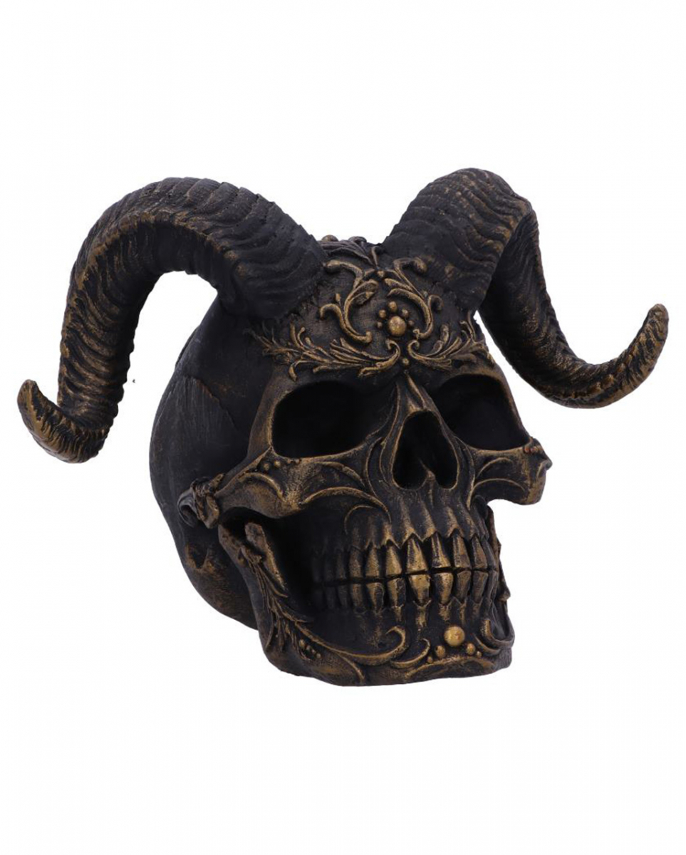 Gehörnter Totenschädel ",Diabolus", 18 cm Gothic- und Metal-Dekoration in Form eines teuflischen Schädels Unser gehörnter Totenschädel ",Diabolus", macht sich hervorragend in einer Sammlung für Okkulte Deko-Objekte. Seine eindrucksvollen Widderhörner sorgen neben den floralen Mustern für Begeisterung. Unser teuflischer Deko-Totenkopf besteht aus Kunststein und ist sorgfältig von Hand bemalt. Er ist mit großen, geschwungenen Hörnern sowie filigranen Blumenmotiven geschmückt, ein toller Kontrast für alle, die es mystisch lieben. Lieferumfang: 1 x Gehörnter Totenschädel ",Diabolus", 18cm Farbe: Antik Gold, Braun Größe: ca. 18 x 14 x 13 cm Gewicht: 883 g Material: Polyresin (Kunststein) Totenschädel mit Hörnern im Okkult-Design Florales Motiv und Widderhörner als Verzierung Mystik-Dekoration für Gothic und Heavy Metal Fans Der Artikel ist ein Dekorationsartikel. Nicht für Kinder unter 3 Jahren geeignet. Kann Kleinteile enthalten, die verschluckt werden können – Erstickungsgefahr. Von Feuer und offenen Flammen fernhalten.
