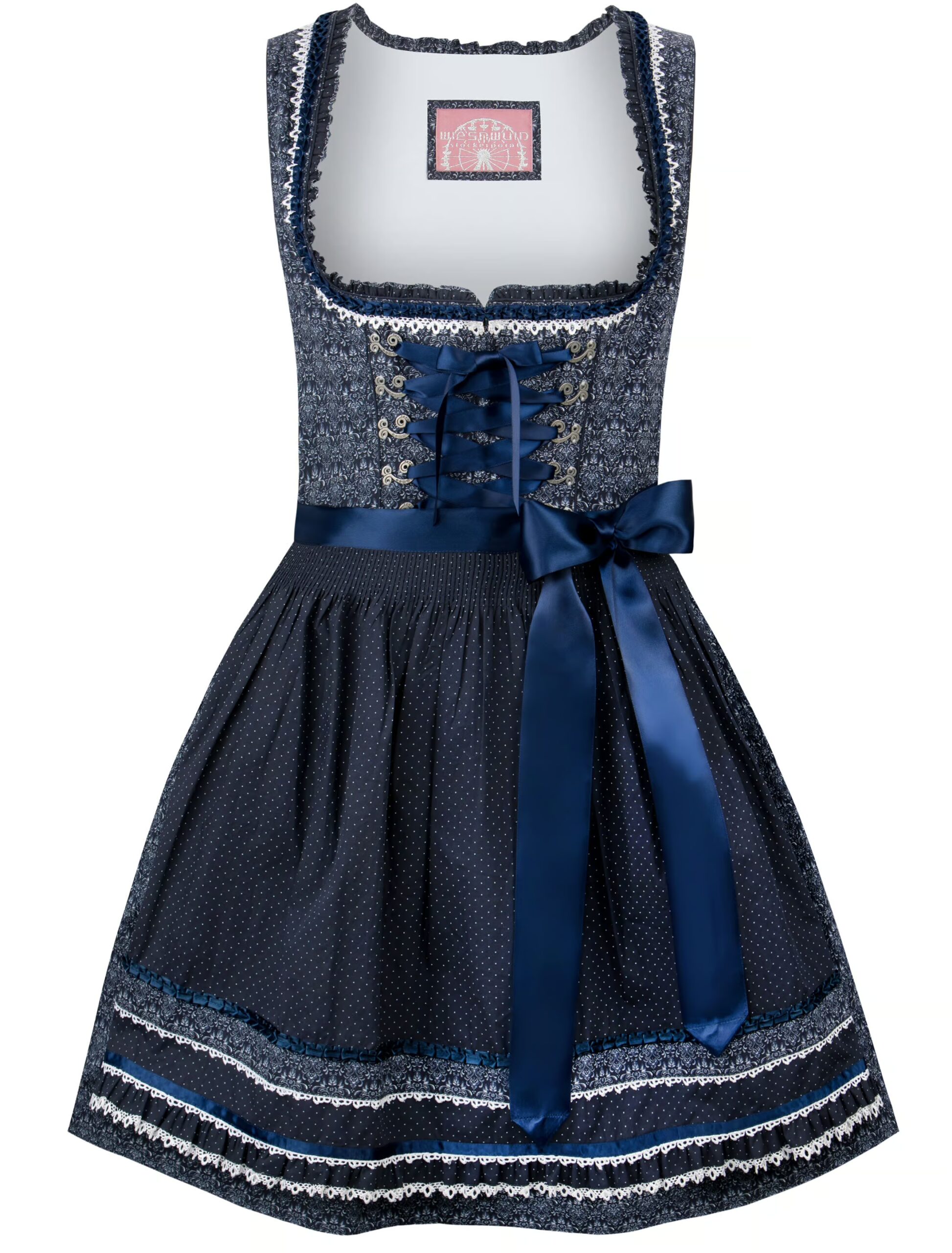 Das Dirndl Kim ist das perfekte Kleidungsstück für jedes Herbst- oder Volksfest. Mit seinem floralen Muster und verspielten Rüschen am Dekolleté verleiht es Dir einen traditionellen und gleichzeitig modernen Look. Die verzierten Miederhaken, wodurch das farblich abgestimmte Satinband eingefädelt wird, verleiht dem Outfit einen eleganten Vintage-Look. Die Schürze ist zusätlich mit Zierborten versehen, wodurch das Dirndl traditionell und zugleich modern wirkt. Kombiniere das Dirndl Kim mit einer unseren Dirndlblusen und ein Blumen-Haarkranz und ziehe alle Blicke auf dich! Passform: Normal Länge: 55 cm