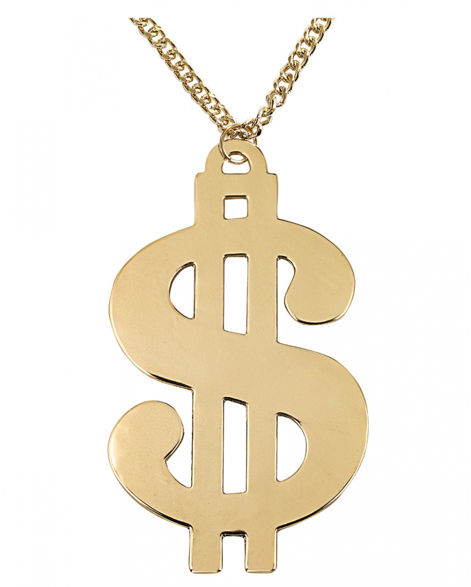 Dollarzeichen Halskette Goldene Dollar Halskette als Kostümzubehör für dein Gangster Outfit Unsere goldene Dollarzeichen Halskette ist genau das Richtige für jeden angehenden Gangster-Rapper, Zuhälter oder Bordellbesitzer. Die Halsketten mit viel Bling Bling sind das ideale Modeaccessoire für alle, die auf dicke Hose machen wollen. Die fette Rapper Kette pimpt deinen Auftritt auf und macht dich zum absoluten First Class Gangster im Money Boy Stil. Lange Goldketten mit fetten Bling Bling Zeichen und Glitzerapplikationen daran sind ein typisches Erkennungsmerkmal für die Jogginghosen Gangster. Unsere goldene Dollarzeichen-Halskette hat ein ca. 10 cm großes Dollar Zeichen an einer ca. 40 cm langen Goldkette hängen. Lieferumfang: 1 x Dollarzeichen Halskette Größe: ca. 40 cm lang Farbe: Gold Material: Metall