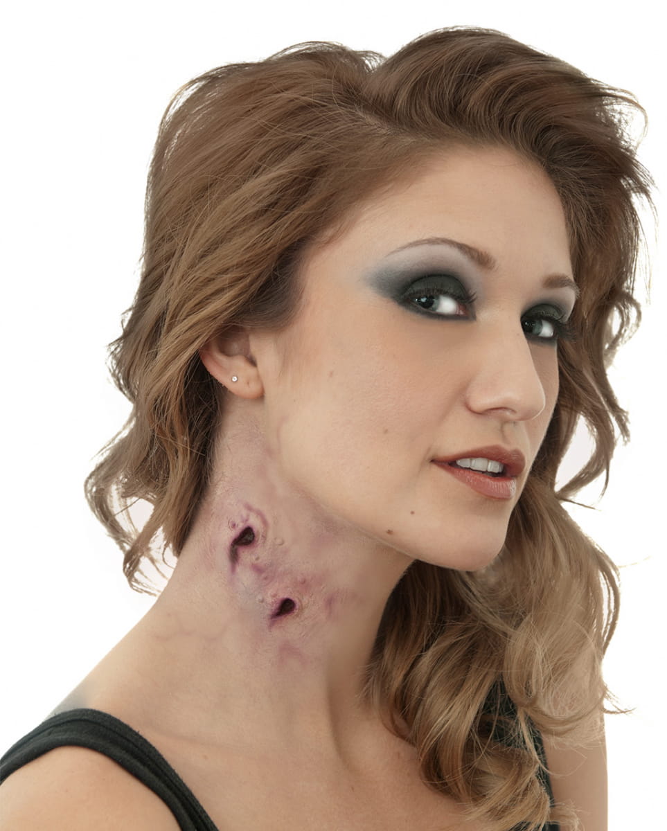 Vampirbiss Latexwunde für Fasching und Halloween Eindrucksvolle Vampirbiss Wunde als Latexapplikation Die Latexwunde eines Vampirbiss mit zwei großen Löchern, die die spitzen Vampireckzähne hinterlassen haben, sind ein eindrucksvolles Halloween Make-up. Schminke dich jetzt als Opfer eines Vampirs und werde damit selber zum Blutsauger. Unsere Vampirbiss Latexwunde ist ein perfekter Spezial Make-up Effekt für Halloween, Fasching und LARP. Die Vampirbiss Wunde ist aus weichem, hochwertigem Latex hergestellt und wird mit Mastix Hautkleber oder Flüssiglatex auf die vorher gereinigte Haut montiert. Am besten sieht der Dracula Biss natürlich aus, wenn dieser noch effektvoll mit Filmblut geschminkt wird. Nach Benutzen der Dracula Biss Latexapplikation lässt sich diese wieder problemlos abziehen und kann mehrfach wiederverwendet werden. Lieferumfang: 1 x Vampirbiss Latexwunde Material: Latex Hautkleber, Flüssiglatex und Filmblut nicht inkl.
