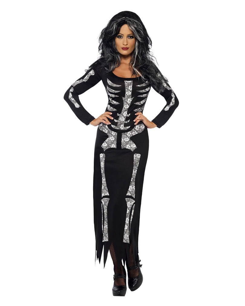 Skelettmotiv Schlauchkleid Das heiße Skelettkleid lässt sogar Morticia im Schatten stehen! Mit dem Skelettmotiv Schlauchkleid stiehlst du so manchem anderen Partygast gehörig die Show, denn das sexy Knochenkleid im Halloween Stil zieht einfach alle Blicke auf sich. Das Skelettmotiv Schlauchkleid reicht bis zum Boden und ist unten fransig geschnitten. Das sexy Skelettkleid ist sehr figurbetont geschnitten hat einen tiefen Ausschnitt. Das Skelett Motiv reicht bis über die Ärmel und wird zusätzlich durch schicke Blüten verziert. Lieferumfang: 1 x Skelettmotiv Schlauchkleid Inhalt: 1 x Schlauchkleid mit langen Ärmeln Farbe: Schwarz/Weiß Erhältliche Größe: S, M, L, XL Material: 100% Polyester Cooles Knochenkleid für atemberaubende Kostümfeste Abmessungen S 36/38 M 40/42 L 44/46 XL 48/50 Brustumfang ca. 88-90 cm ca. 94-98 cm ca. 102-107 cm ca. 112-117 cm Taillenumfang ca. 67-70 cm ca. 75-77 cm ca. 81-86 cm ca. 91-97 cm Hüftumfang ca. 94-97 cm ca. 100-104 cm ca. 108-113 cm ca. 119-124 cm Achtung: Der Artikel ist ein Kostüm für Erwachsene und ist kein Spielzeug. Nicht für Kinder unter 3 Jahren geeignet. Kann Kleinteile enhalten, die verschluckt werden können. Es besteht dadurch Erstickungsgefahr.Vor Feuer und Flammen entfernt halten