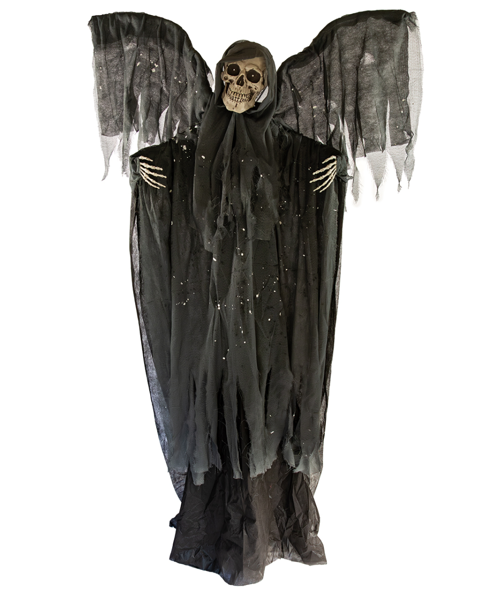 Riesiger Flügelschlagender Todesengel mit Leuchtaugen und Sound 195 cm Bewegliche XL-Todesengelfigur als Halloween Partydekoration Unser riesiger flügelschlagender Todesengel mit Leuchtaugen und Sound ist ein Highlight auf deinem Horror Event. Die Halloween Dekofigur in Lebensgröße überzeugt mit Flügelschlag, Phrasen und Leuchtaugen. Die Figur wird zusammengebaut und misst dann ca. 195 x 110 x 16 cm. Du benötigst 3 x AA-Batterien, um sie zu aktivieren, dies geschieht durch laute Geräusche in der Nähe. Sobald der schwarze Todesengel zum Leben erwacht, beginnt der Horror. Lieferumfang: 1 x Riesiger Flügelschlagender Todesengel mit Leuchtaugen und Sound 195cm Farbe: Schwarz, Grau, Weiß Größe: ca. 195 x 110 x 16 cm Batterien: Es werden 3 x AA-Batterien benötigt, nicht inkl. Material: Kunststoff, Polyester, Draht Lebensgroßer Reaper mit Flügeln als Halloween Animatronic Rote Augen bewegen sich mit dem Oberkörper hin und her Seine dunklen Schwingen bewegen sich zeitgleich auf und ab Skeletthände greifen nach dir Spricht und murmelt Bodenlanges Gewand im vermodernden Look Die Horror Animatronic ist soundaktiviert Perfekt für Groß-Events Einfach zusammenzubauen Batteriebetrieben, nicht inkl