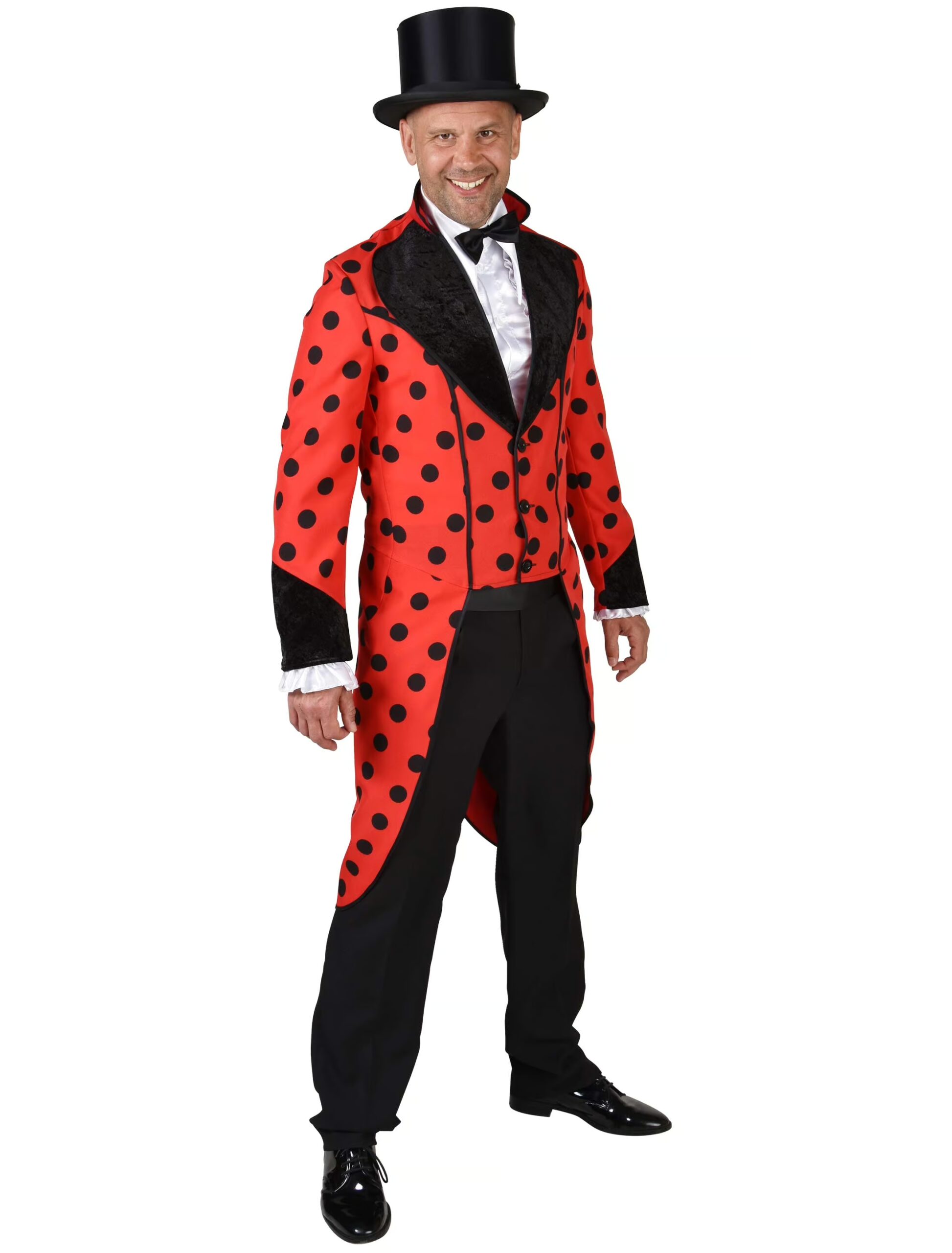 Ein Frack mit dem Du garantiert punkten kannst! Dieser Marienkäfer Frack ist perfekt für alle Herren, die sich von der Masse abheben, aber sich dennoch stilsicher kleiden möchten. Der Frack überzeugt durch den zur Rückseite verlaufenden asymmetrischen Schnitt sowie durch den roten Stoff, der rundum mit schwarzen Punkten verziert ist. In der Front befindet sich eine Knopfleiste, diese beginnt mit einem schönen schwarzen Revers aus Pannesamt. Die schwarzen Ärmelenden sowie der hohe Kragen zieren den Frack und runden den Marienkäfer Frack gekonnt ab!