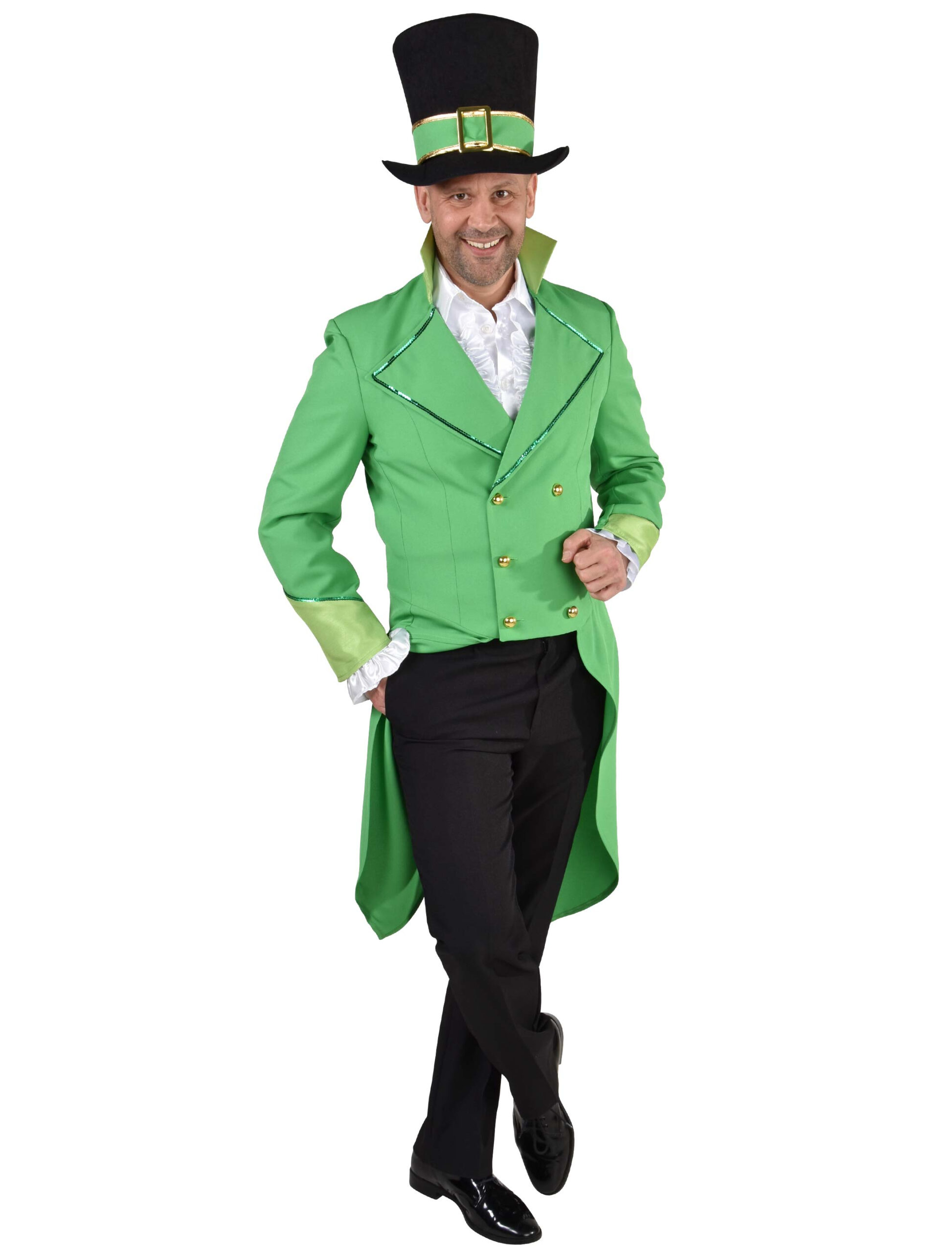 Grasgrün wie die Nationalfarbe der Iren präsentiert sich dieser stylische Frack, der extra für den St. Patricks Day designt wurde. Natürlich trägt der Herr von Welt ihn auch zum Karneval. Zeige Deine Verbundenheit mit Irland mit diesem ganz besonders auffälligen Stück. Eine schmale Borde glitzernder grüner Pailletten lässt den Frack noch edler wirken, goldene Knöpfe zieren seine Front. Der Schwalbenschwanz ist knielang, Details an Ärmeln und am Kragen sind in hellerem Grün abgesetzt.