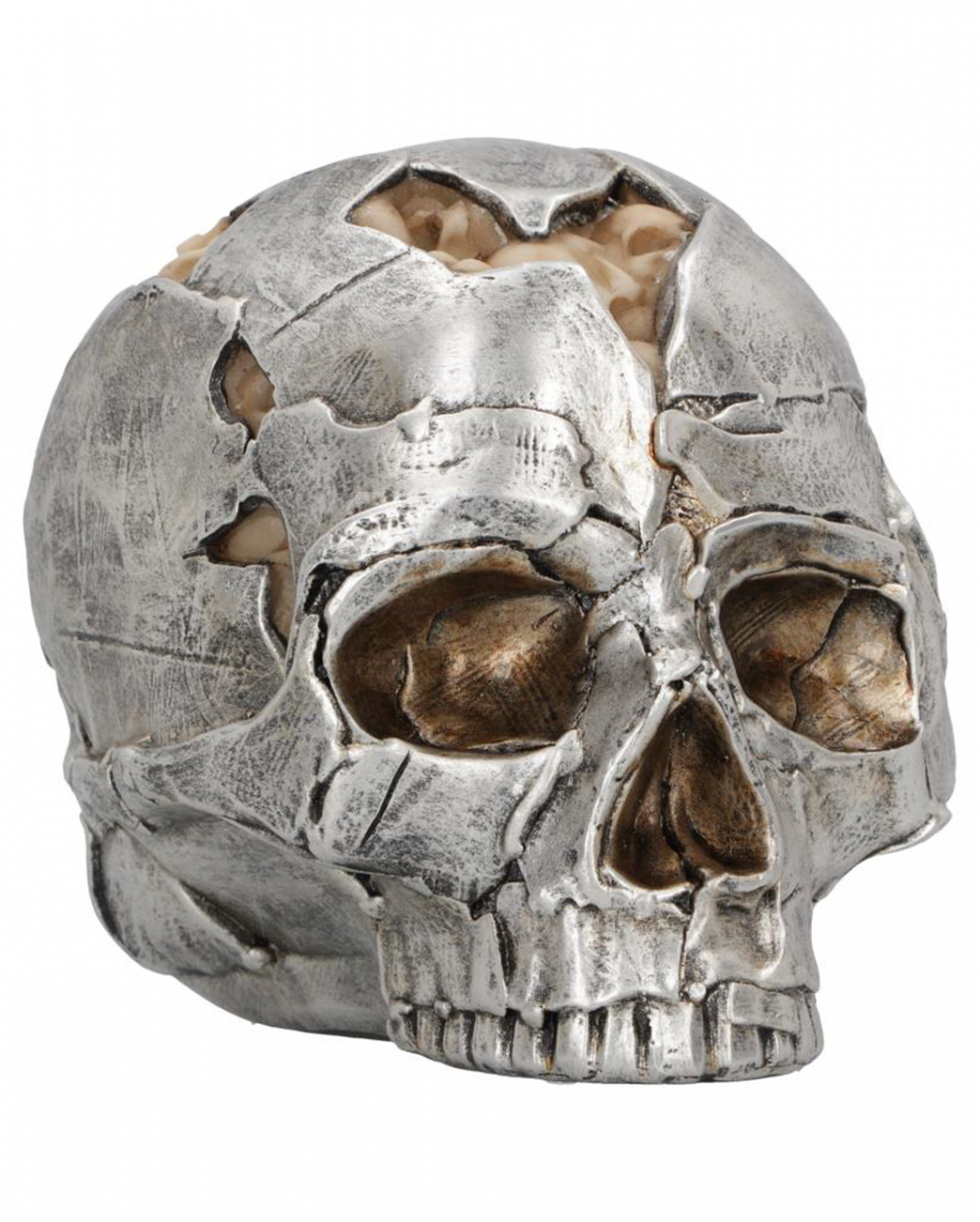 Silberfarbener Fracture Totenkopf 16cm Totenschädel mit beigen, kleinen Köpfen als Einschlüsse Ein beeindruckender Totenkopf, bei dem es scheint, als sei er aus Metallfetzen geformt worden. In den aufgeplatzten Rissen erscheinen zum Teil kleinere Schädel, die sich auf der Schädeldecke gebildet haben und einen Gehirn-Effekt erzeugen. Der silberfarbene Fracture Totenkopf ohne Unterkiefer wurde aus feinstem Polyresin gegossen und anschließend fachmännisch von Hand bemalt und ist die perfekte Ergänzung für jedes alternative Zuhause und deiner Schädelsammlung. Lieferumfang: 1 x Silberfarbener Fracture Totenkopf 16cm Farbe: Silber, Beige, Braun Größe: ca. 16 x 13 x 12 cm Gewicht: 590 g Material: Polyresin (Kunststein) Fraktur Totenschädel im Metallfetzen Look Kleinere Schädel in den Rissen des Totenkopfs Außergewöhnliche Gothic- und Heavy Metal Deko Aus hochwertigem Polyresin gegossen Von Hand bemalt
