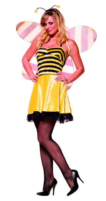 Freche Honig-Biene Kostüm Die freche Honigbiene klaut nicht nur Willi seinen Honig, sondern fliegt auch lüstern von Blüte zu Blüte, um sich immer den besten Nektar zu sichern. Es ist wirklich schwierig die sexy Biene an sich zu binden und es bedarf großer Kunst das Schleckermäulchen mit süßem anzulocken. Das verführerische Kostüm der frechen Honigbiene besteht aus einem Minikleid mit Spaghetti-Trägern, das als Rockfarbe ein leuchtendes, schimmerndes gelb aufweist und zum Brustbereich in eine schwarz /gelb gemustertes Top im Streifenmotiv wechselt. Der Rocksaum ist mit verführerisch, zarter, schwarzer Spitze eingesäumt. Das erotische Bienen-Outfit wird durch zarte, große Bienenflügel komplettiert, während die Frisur durch einen Haarreif mit Bienen-Fühlern unterstrichen wird. Farbe: Schwarz/Gelb Größe: L 40/42 Material: 100% Polyester