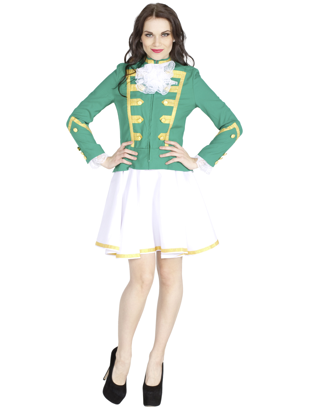 Funkenmariechen, auch Tanzmariechen genannt, sind auf Karnevalspartys und -umzügen gar nicht mehr wegzudenken. Werde auch Du mit diesem Kostüm zum hübschen Funkenmariechen! Alles, was Du dafür brauchst, ist diese tolle grüne Uniformjacke, die mit einem auffälligen Jabot verziert ist, und ein Kleid, das Dir genug Beinfreiheit für Deine Tanzschritte gibt. Die Jacke ist in der Front, an den Ärmeln und am Kragen mit goldenen Applikationen und Knöpfen veredelt. Der enge Schnitt, die Schulterpolster und das kleine Schwalbenschwänzchen auf der Rückseite betonen perfekt Deinen Oberkörper. Der auffällige Spitzen-Jabot lässt sich durch Klettverschlüsse an der Jacke befestigen. Auch die Ärmel der Damen Jacke sind passend dazu mit weißer Spitze unterlegt. Das weiße Kleid ist hüftabwärts weiter ausgestellt und wird am Saum von einer goldenen Borte geziert. Die Jacke ist verschließbar durch einen Reißverschluss in der Front. Mit dem passenden Dreispitz in Grün wirst du zum angesagtesten