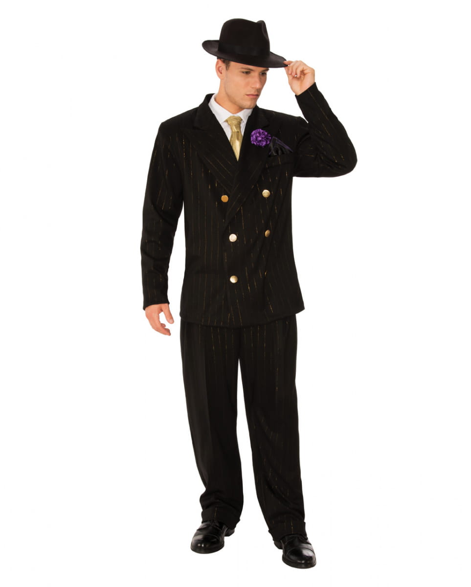 Gangster Herrenkostüm mit Blume als Verkleidungs-Set für Fasching, Karnevalsparties und Motto Party Werde zum zweifelhaften Gentleman mit dem Charme eines Al Capone Als gewiefter Verbrecher kontrollierst Du die Motto Party und auch an Karneval läuft nichts ohne Schutzgelderpressung. Wer Dir kein Bier ausgibt, kann sich schon mal auf Beton an den Füßen und ein Bad im See gefasst machen. Mit dem Gangster Herrenkostüm mit Blume wirst Du zum eleganten Nachfolger von Al Capone. Die Damen werden sich gerne mit Dir abgegeben, denn schließlich versprühst Du eine Menge Sex Appeal mit Deinem Gangster Kostüm. Mit dem Gangster Herrenkostüm mit Blume bist Du ein angesehener Gast auf der Motto Party. Das schwarze Jackett mit den goldenen Knöpfen daran lässt Deine Schultern beeindruckend breit aussehen. Du bist eben ein echt starker Typ. Passend dazu gehört zu dem Gangster Verkleidungs-Set die schwarze Anzughose. Natürlich darfst Du auch die Krawatte nicht vergessen umzubinden. Ganz stilecht befindet sich außerdem eine lilafarbene Blume im Knopfloch. Lieferumfang: 1x Gangster Herrenkostüm mit Blume Inhalt: 1x Jackett, 1x Hose, 1x Krawatte, 1x Blume im Knopfloch (Boutonniere) Farbe: Schwarz/Weiß/Gold/Lila Größe: One Size, XL Material: 100% Polyester Mehrteiliges Gentleman Kostüm für Fasching Hut und Schuhe nicht enthalten Größe: One Size (48-54) XL (56-58) Brustumfang ca. 107-117 cm ca. 127 cm Taillenumfang ca. 76-102 cm ca. 107-117cm Achtung: Der Artikel ist ein Kostüm für Erwachsene und kein Spielzeug. Nicht für Kinder unter 3 Jahren geeignet. Kann Kleinteile enthalten, die verschluckt werden können – Erstickungsgefahr. Von Feuer und offenen Flammen fernhalten.