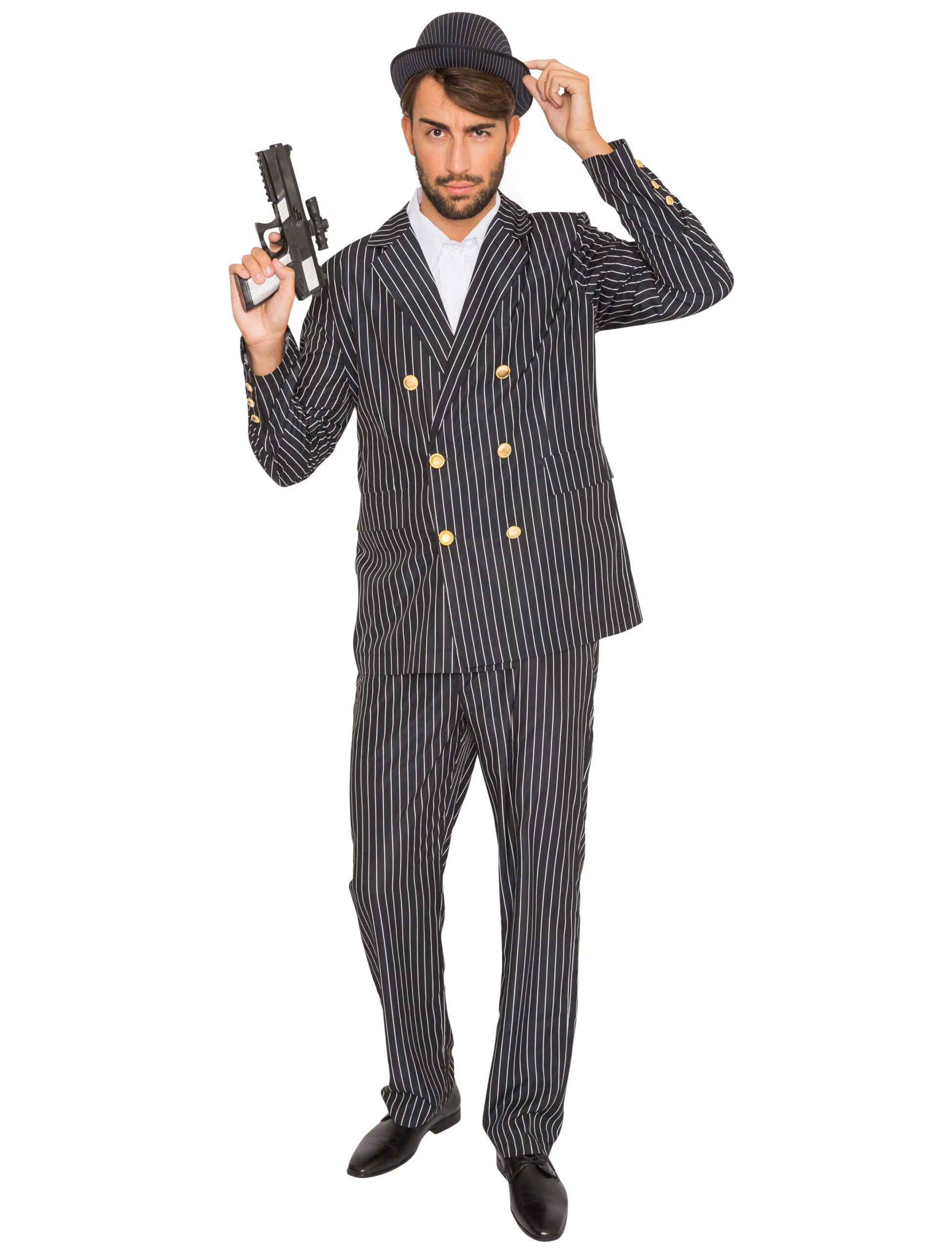 Mit unserem Gangster Kostüm mit Nadelstreifen beherrschst Du elegant die Straßen von Chicago. Der zweiteilige 20er Jahre Anzug, bestehend aus Jacke und Hose, macht Dich zum Anführer der Unterwelt und König der Mafia. An Karneval kannst Du mit einer Pistole bewaffnet den anderen Besuchern zeigen, wer die Kontrolle über das Viertel besitzt. Der Zweireiher mit goldenen Knöpfen kann in vielen Größen bestellt werden und lässt sich perfekt mit Schuhen aus Leder tragen. Das Kostüm besteht aus einer Jacke sowie aus einer Hose. In der Front der Jacke sind Knöpfe vernäht, zwei davon mit verwendbaren Knopflöchern. Die Jacke besitzt zudem zwei Taschen. Die Hose hat vorne einen Reißverschluss und einen Knopf. Sie besitzt vorne zwei Taschen. Ein Gummizug ist im Hosenbund verarbeitet, sie hat jedoch keine Gürtellaschen.