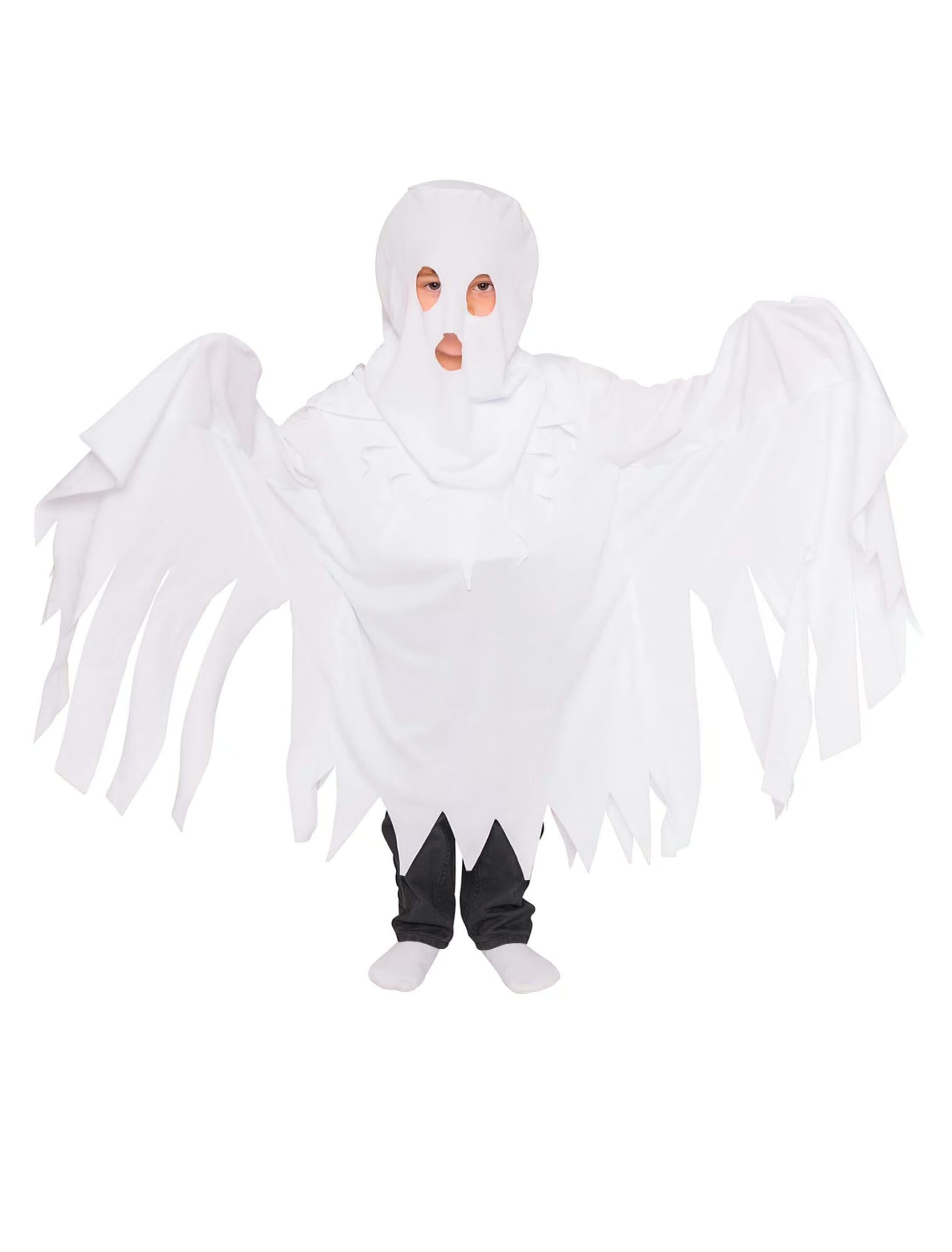 Schaurig schön ist das weiße Geisterkostüm für Kinder, das aus jedem Kind im Handumdrehen ein gruseliges oder auch freundliches und hilfsbereites Gespenst macht. Das fast bodenlange Kinderkostüm ist aus Polyester gefertigt und besteht aus einem weitgeschnittenen Shirt mit Kapuze. Die langen Fransen an den Ärmeln und der gezackte Saum sowie die Mund- und Augenöffnungen in der Kapuze verstärken den Gruseleffekt. Es ist die perfekte Maskerade für Halloween, die Faschingsfeier im Kindergarten oder das Kostümfest in der Schule. Wenn Dein Kind so durch die Räume schwebt macht es selbst jedem alten Schlossgespenst Konkurrenz.