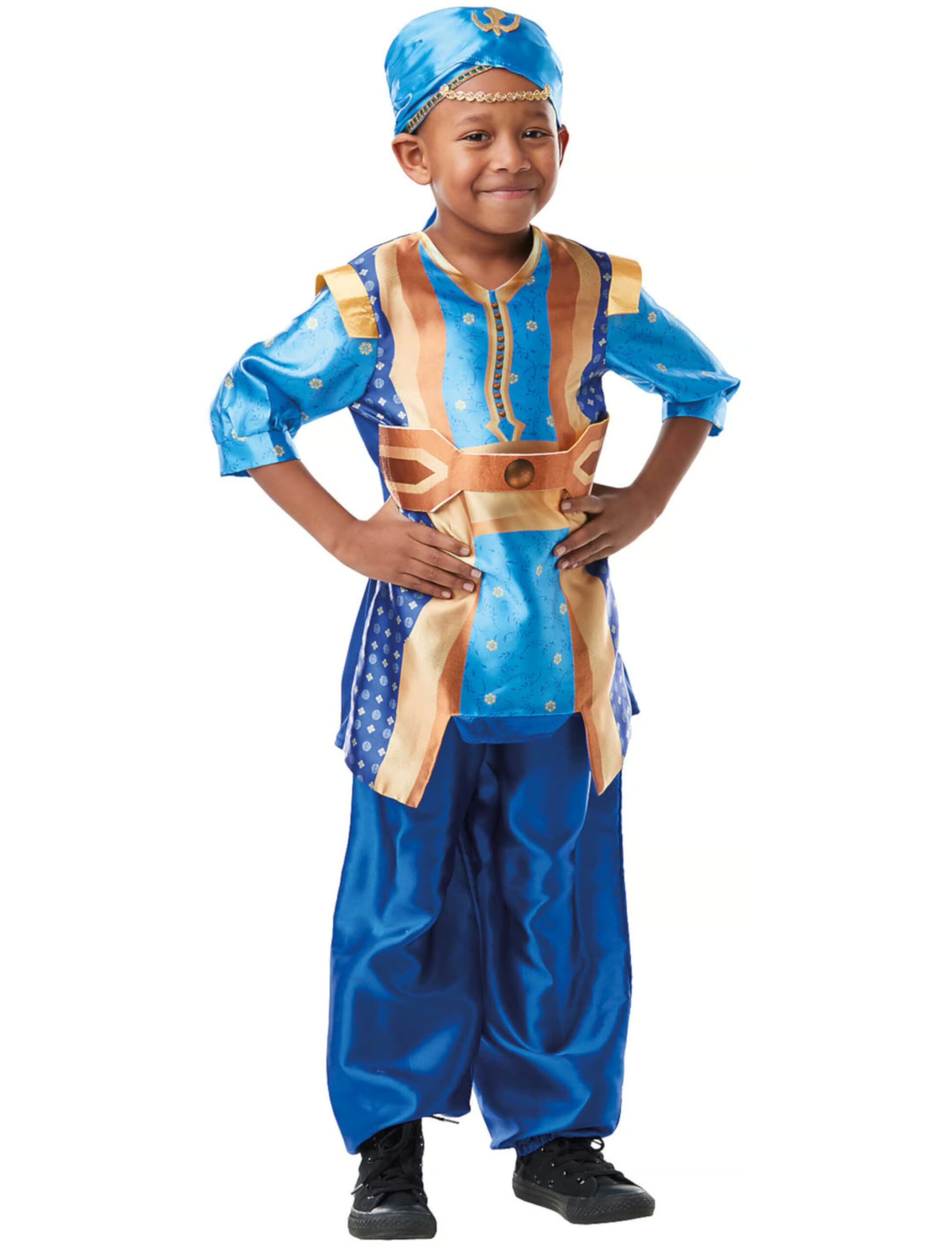 Ganz bezaubernd ist das dreiteilige Kinderkostüm Genie, das aus Deinem Sprössling zum Fasching, Kindergeburtstag oder wann immer der Kleine möchte, einen wunderschönen und liebenswerten kleinen Flaschengeist macht, der genau wie im Märchen die Herzen der Menschen berührt und ihnen ein Lächeln ins Gesicht zaubert. Das prachtvolle, orientalische Kostüm mit seinem seidigen Schimmer in Blau und Gold besteht aus einem aufwendig gearbeiteten, fein bedruckten und goldverzierten hellblauen Oberteil mit angedeuteter Weste, einer royalblauen Pluderhose und dem, mit einer goldenen Stirnkette geschmückten, himmelblauen Turban. In diesem prächtigen Kostüm ist Dein kleiner Liebling der wundervollste Flaschengeist der Welt, um den Du sicher beneidet wirst. Das perfekte Kostüm, das in einer Gruppe mit Aladdin und Jasmin nicht fehlen darf! Bei diesem Kostüm handelt es sich um offiziellen DISNEY Merchandise!