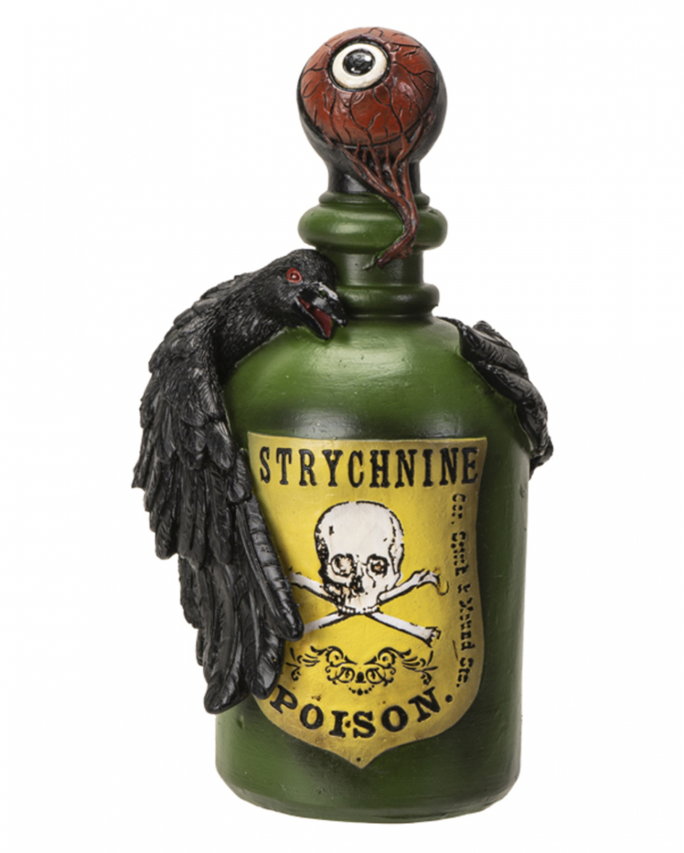 Grüne Giftflasche mit Raben und blutigem Augapfel 20 cm Romantischer Gift-Flakon mit Strychnin Label und Krähe als Zierde Die grüne Giftflasche mit Raben und blutigem Augapfel ist eine tolle Gothic- und Halloween Dekoration. Krähen stehen für das unheimliche, unheilvolle und den Tod. In manchen Kulturen aber auch ein Glücksbringer. Auf der grünen Giftflasche befindet sich ein schwarzer Rabe, der die Giftflasche mit seinen Flügeln umarmt. Die grandios aussehende Giftflasche mit schwarzem Vogel und Augapfel ist aus Polyresin gegossen und wurde anschließend sorgfältig von Hand bemalt. Die Flasche ist reine Dekoration und kann nicht mit Flüssigkeit befüllt werden. Lieferumfang: 1 x Grüne Giftflasche mit Raben und blutigem Augapfel 20 cm Farbe: Grün, Schwarz, Gelb, Rot Größe: ca. 20 x 11 x 10 cm Material: Polyresin (Kunststein) Grüne Giftflasche mit blutigem Augapfel und Raben als Motiv Flasche ist reiner Ziergegenstand und kann nicht befüllt werden Aus hochwertigem Polyresin hergestellt Von Hand bemalt