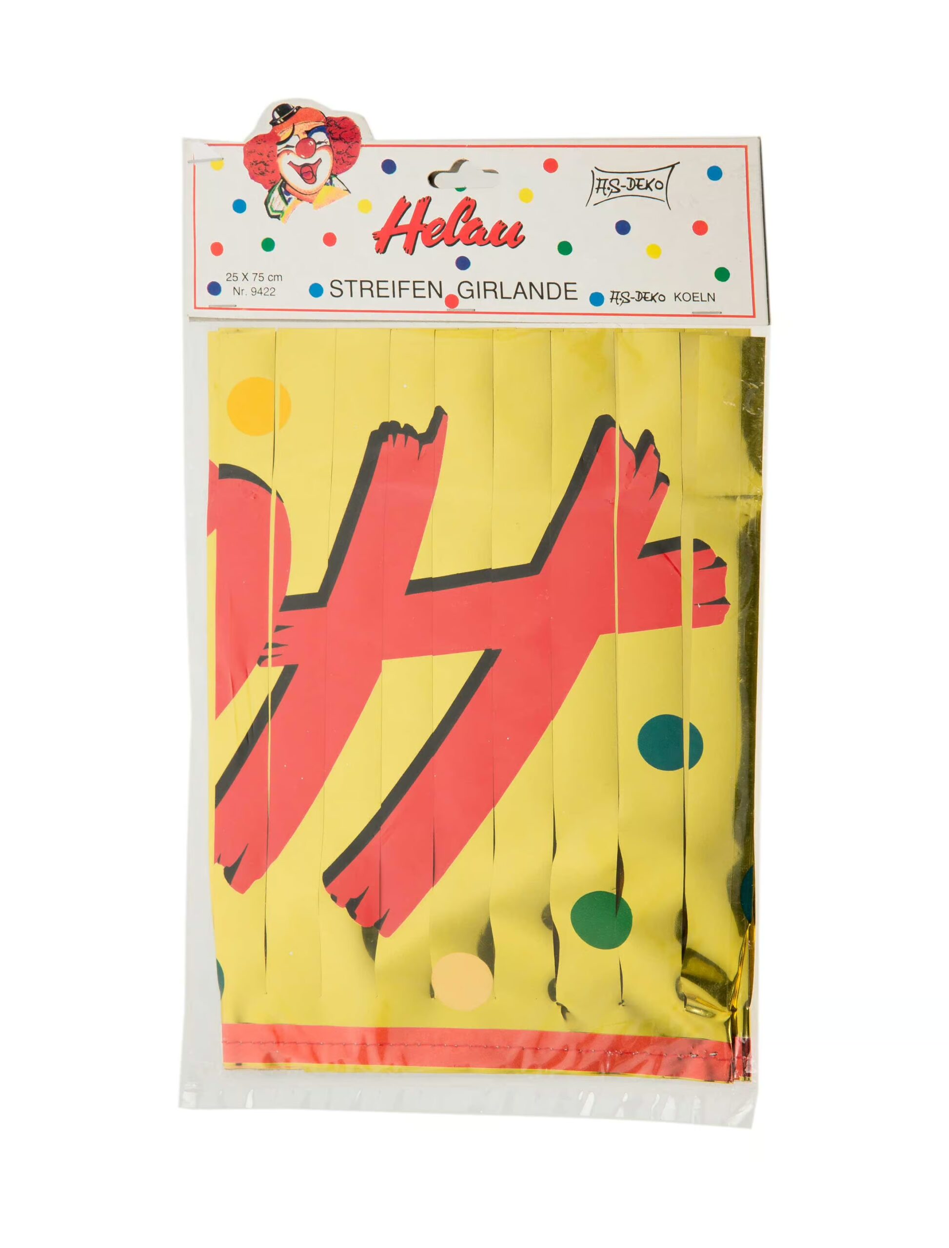 Ideal für alle überzeugten Jecken und Narren ist die 0,75 Meter große Streifen-Girlande Helau Folie auf goldfarbenem Untergrund mit bunten Punkten und rotem HELAU-Schriftzug – einfach beim nächsten Karnevalsumzug als Deko an Wand oder Fenster hängen und schon weiß jeder, dass man bei Dir herzlich willkommen zum Feiern ist! Maße: 25 x 75 cm