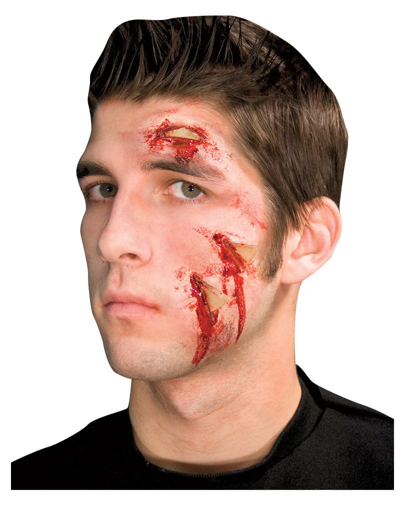 Glasscherben Wunde 3-teilig Glassscherben aus Latex für den krassen Spezial Make Up Effekt Krass!! Wer im Glashaus sitzt soll nicht mit Steinen werfen – sonst sieht man hinterher so aus wie man aussieht! 3-teilige Glasscherben Wunde aus Latex für den totalen Horror-Effekt. Die super realistisch aussehenden Glasscherben werden sogar von der Feuerwehr und dem Roten Kreuz verwendet um realistische Unfalldarstellung zu simulieren. Die brutal aussehende Glasscherben-Wunde wird mit Mastix (Hautkleber) auf die Haut aufgeklebt und mit Make Up und Filmblut perfektioniert. Mastix Hautkleber klein , Unfall Make Up / Injury Stack , Blutschorf Altöl Fresh Scratch und Blut Gel / Blood Gel 30ml nicht inkl. Lieferumfang: 1x Glasscherben Wunden Set Inhalt: 3x Glasscherben Aplikationen Material: Latex Haukleber und Filmblut nicht inkl.