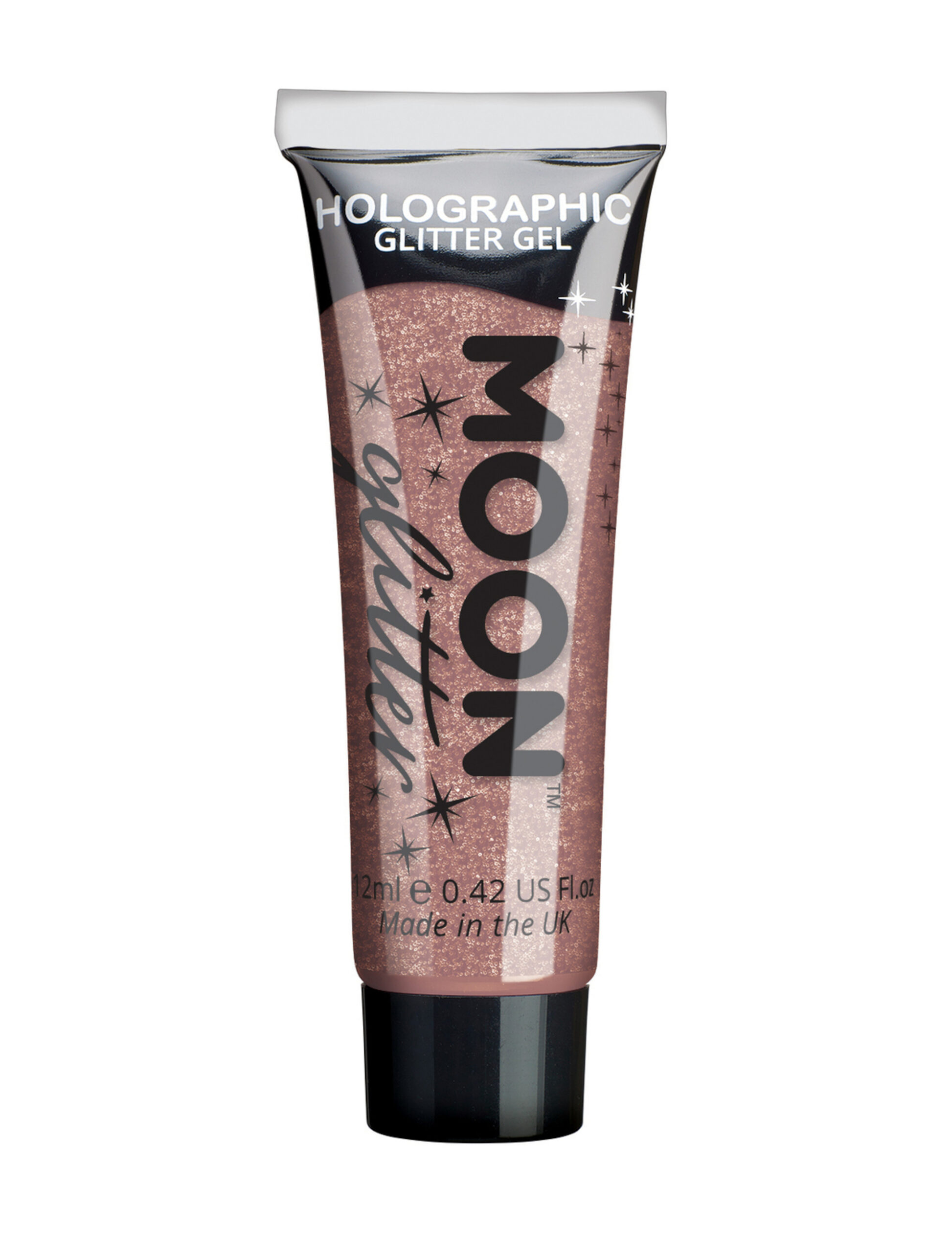 Mit diesem Glitzergel in Rosegold, das durch seine holographischen Glitzerpartikel gleißende Licht- und Glanzeffekte auf die Haut zaubert, erhältst Du ein raffiniertes Make-Up Zubehör um das Dich jede Faschingsprinzessin beneidet. Mit ihm kannst Du Gesicht, Hals, Schultern und Dekolletee nicht nur wirkungsvoll betonen, sondern sie werden durch die irisierenden Glitzerpartikel zu glamourösen Blickfängern. Die perfekte Make-Up Ergänzung für schillernde Faschings-, Karneval- und Motto Partys!