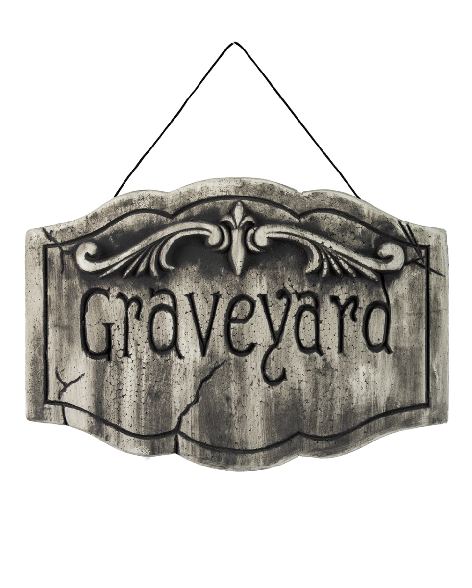 ",Graveyard", Schild als Hängedekoration 29 x 27 cm Graveyard Schild als Horror Deko Unser Graveyard Schild als HängedekorationHalloween-Gäste magisch auf sich und entführt sie direkt in eine Friedhofsszenerie. Schmücke mit dem modrigen Graveyard Deko-Schild Wände und Türen und sorge für Grusel-Feeling! Unser ",Graveyard", Schild als Hängedekoration misst etwa 29 x 27 x 2,5 cm und ist aus robustem Polyfoam gefertigt. Mystische Blumenmotive umranken den Schriftzug und sorgen für den Hauch der Vergänglichkeit. Lieferumfang: 1 x ",Graveyard", Schild als Hängedekoration 29 x 27cm Farbe: Grau, Braun, Schwarz Größe: ca. 29 x 27 x 2,5 cm Material: Polyfoam Schön gearbeitet ",Schrifttafel aus Stein", mit der geschnitzten Inschrift Graveyard (Friedhof) Mit Blumenmotiv Halloween Hängeschild als Requisite deine gruselige Friedhofsszenerie