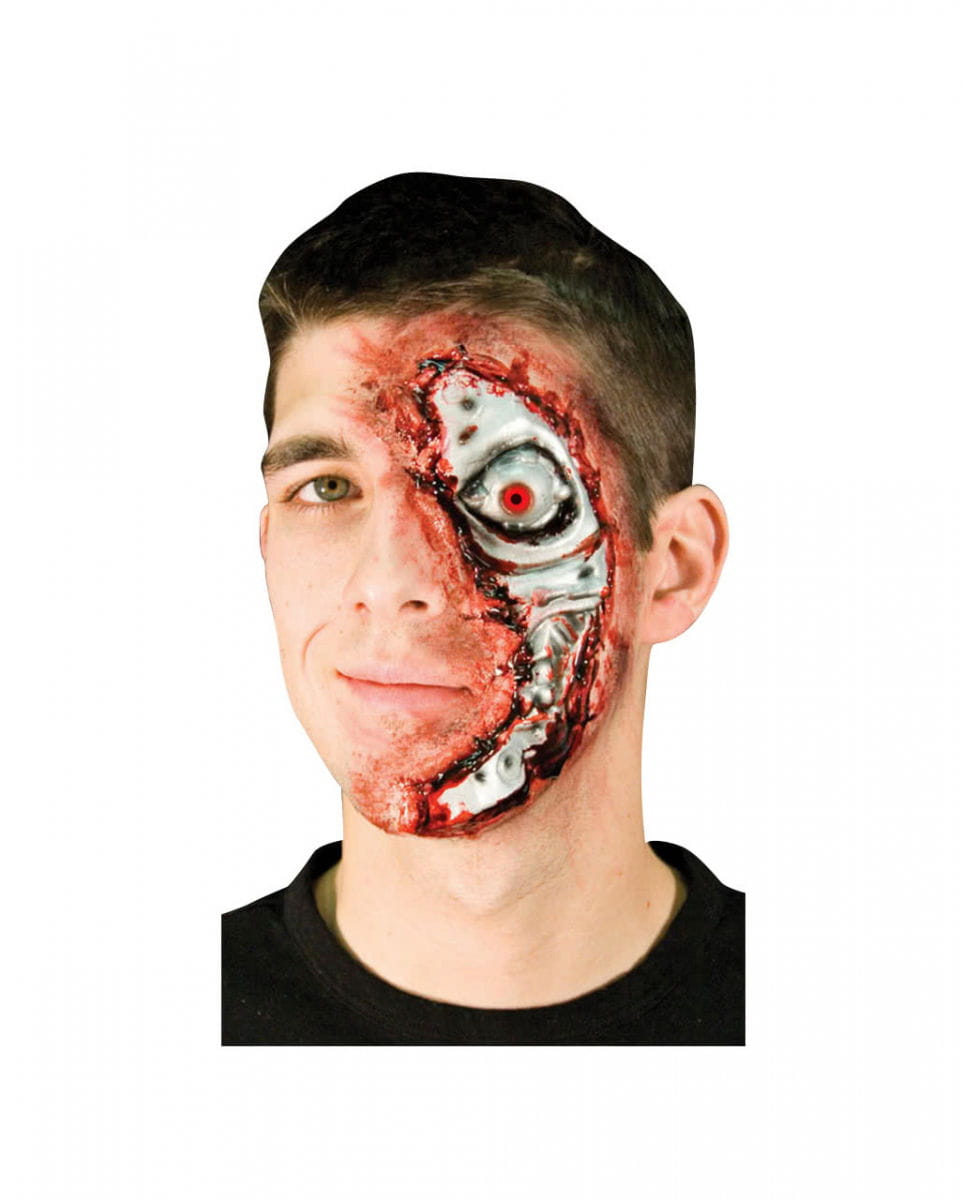 Große Roboter Wunde Mit der Science Fiction Terminator Wunde wirst Du zur Kampfmaschiene Mit der großen, über das halbe Gesicht reichende Terminator-Platine aus Latex wirst du zur Mischung aus Mensch und Maschine. Mit der Latex Applikation kannst du es mit jedem Robotor aufnehmen und wirst damit selber zu Kampfmaschine. Klar das bei dem perfekten Spezial Make Up auch der Terminator Angst bekommt. Ein Muss für alle Schwarzenegger Fans und um als Borg in den Hive einzutreten – Wiederstand ist Zwecklos! Die große Roboter Wunde wird mit Hautkleber (nicht inkl.) auf die Haut aufgeklebt und kann öfters wieder verwendet werden. Besonders echt aus sieht die Terminator Wunde aus wenn diese zusätzlich noch mit Make Up und Filmblut perfektioniert wird. Mastix Hautkleber klein , Hautfarben Make Up Kit / Flesh Stack und Blut Gel / Blood Gel 30ml nicht inkl. Lieferumfang: 1x Große Roboter Wunde Latexapplikation Farbe: Silber, Hautfarbenm Rot Material: Latex