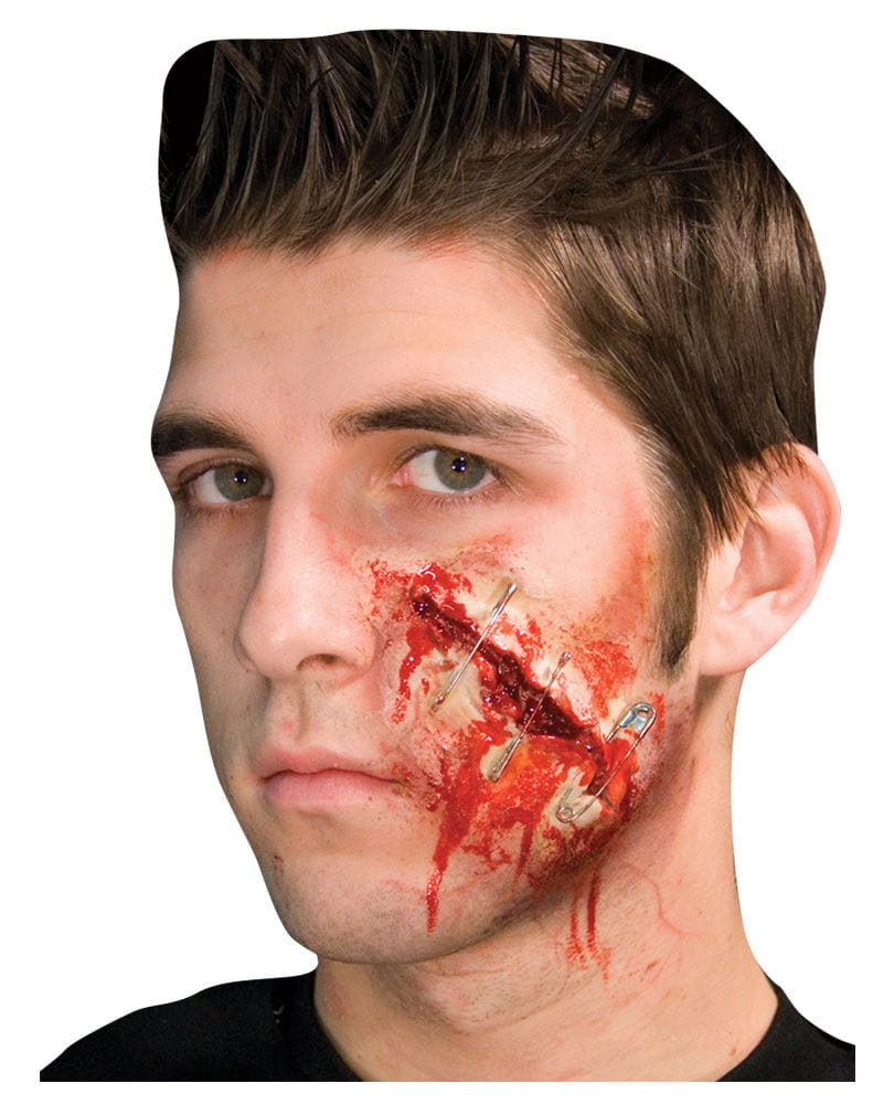 Große Sicherheitsnadel Latexwunde als Halloween Spezial Make-up Professioneller Spezial Make-up Effekt und realistische Unfalldarstellung Schminke Dich doch zu Halloween und Zombie Walk einmal richtig krass und schockiere mit der großen Sicherheitsnadel Latexwunde deine Umwelt. Die große aufgeplatzte Wunde, sieht nach dem Anbringen und Schminken aus, als wäre diese nur noch mit drei Sicherheitsnadeln zusammengehalten. Die Latexapplikation wird mit Mastix Hautkleber oder Flüssiglatex auf die vorher gereinigte Stelle geklebt. Die Ränder und übergänge lassen sich mit Flüssiglatex und Make-up kaschieren. Jetzt noch etwas Filmblut und schon besitzt du eine fantastisch aussehende Sicherheitsnadel Wunde als realistische Unfalldarstellung. Lieferumfang: 1 x Große Sicherheitsnadel Latexwunde Farbe: Hautfarben/Rot Material: Latex Hautkleber, Make-up und Flüssiglatex nicht inkl.