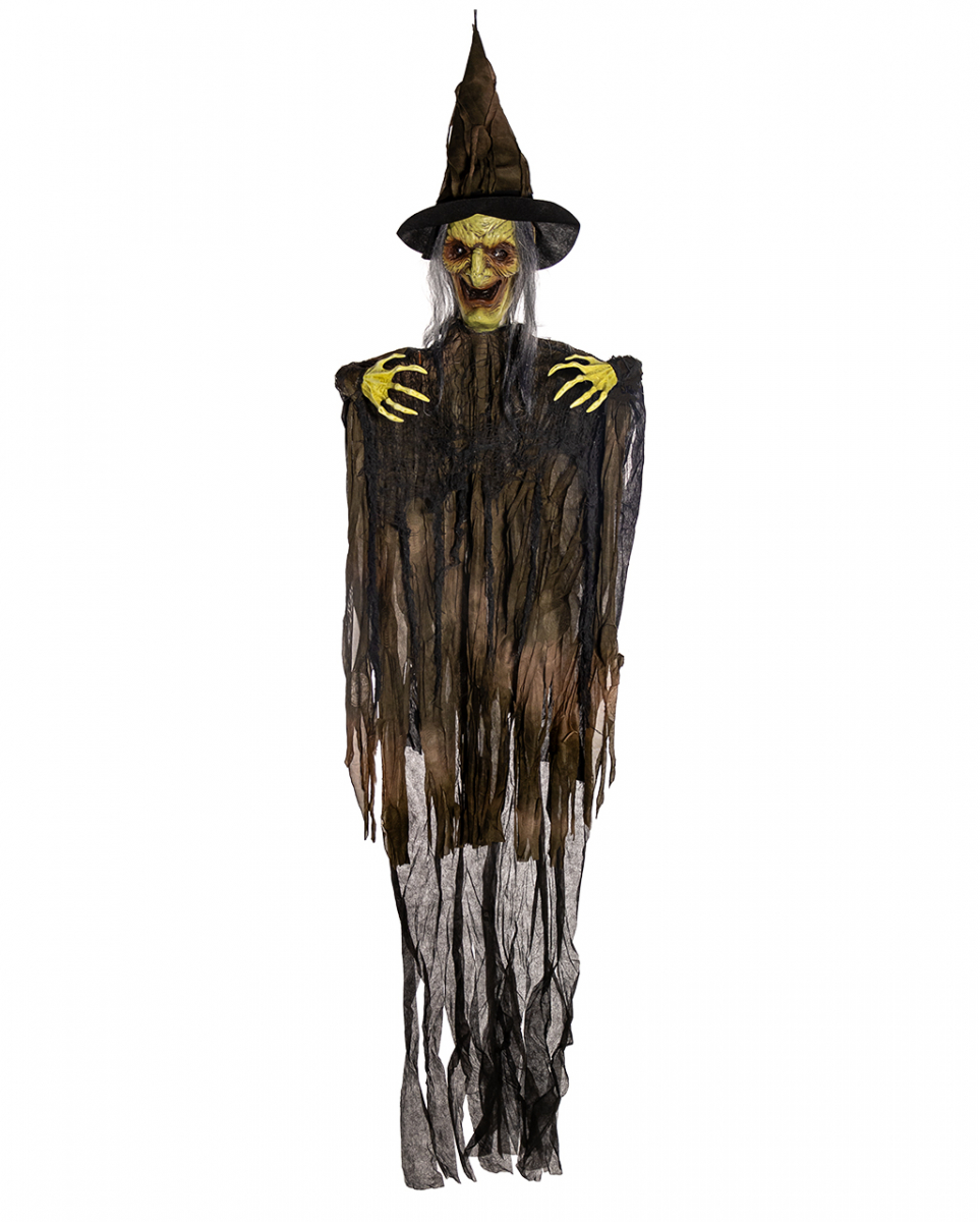 Schreckliche Waldhexe mit Sound, Licht und Bewegung als Halloween Hängefigur 153 cm Eindrucksvolle Hexen Hängefigur mit Geisterbahneffekt für Halloween und Walpurgisnacht Fühlst du schon das Kribbeln, wenn die Nacht hereinbricht und die Hexen erwachen? Die schreckliche Waldhexe mit ihren Leuchtaugen und gruseligen Sprüchen wird dein Zuhause in eine schaurige Kulisse verwandeln. Das wird eine unvergessliche Halloween-Nacht! Die schreckliche Waldhexe wird durch laute Geräusche aktiviert und sorgt mit 3 verschiedenen englischen Halloween-Sprüchen für Gänsehaut. Sie ist stattliche 153 cm groß, hat biegsame Arme und ist perfekt zum Aufhängen. Sie wird mit 3 AA-Batterien bedient. Lieferumfang: 1 x Schreckliche Waldhexe mit Sound, Licht und Bewegung als Halloween Hängefigur 153 cm Farbe: Braun, Schwarz, Grün, Rot Größe: ca. 153 × 75 × 10 cm Gewicht: 500 g Batterien: Es werden 3 AA-Batterien benötigt, nicht inkl. Material: Polyester, Kunststoff, Draht Gruselige Hexe als stimmungsvolle Halloween Dekoration zum Aufhängen Die Hexe bewegt die Arme, lässt ihre Augen gefährlich aufleuchten und spricht 3 verschiedene Halloween-Sprüche (engl.) Die Hexe wird durch laute Geräusche wie Klatschen aktiviert Batteriebetrieben, damit vielseitig zu dekorieren Der Artikel ist eine Halloween Deko Figur und kein Spielzeug. Nicht für Kinder unter 3 Jahren geeignet. Kann Kleinteile enthalten, die verschluckt werden können – Erstickungsgefahr. Von Feuer und offenen Flammen fernhalten.