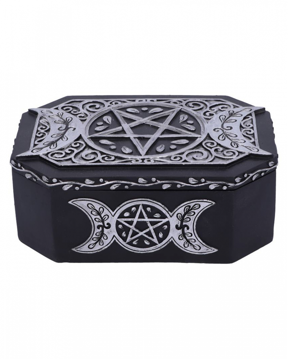 Hecate’s Protection Schmuckschatulle mit Okkulten Symbolen 18cm Gothic Schmuckkästchen mit Dreifach Mond und Pentagramm Von der Göttin der Magie, der Theurgie und der Nekromantie kommt diese tolle Hecate’s Protection Schmuckschatulle mit okkulten Symbolen. Verziert mit kunstvollen silbernen Details, haben die Oberseite des Deckels und die Seiten des Kästchens ein dreifaches Mondpentagramm, das ein beliebtes Symbol der Heiden und Wiccas ist, um die Göttin darzustellen. Der Deckel des Schmuckkästchens lässt sich abnehmen und gibt den Blick auf das Innenfach frei, das sich perfekt zur Aufbewahrung all deiner kleinen Schätze eignet. Gegossen aus feinstem Polyresin und anschließend fachmännisch handbemalt, ist diese Hecate’s Protection Box ideal für jeden Liebhaber von Wicca und Zauberei. Lieferumfang: 1 x Hecate’s Protection Schmuckschatulle mit Okkulten Symbolen 18cm Farbe: Schwarz, Silber Größe: ca. 18 cm Material: Polyresin (Kunststein) Mit okkulten Symbolen verziertes Kästchen Dreifachmond, Pentagramm und florale Muster als Motiv Heidnische und Wiccanische Symbole als Reliefmuster Aus hochwertigem Polyresin gegossen Von Hand bemalt