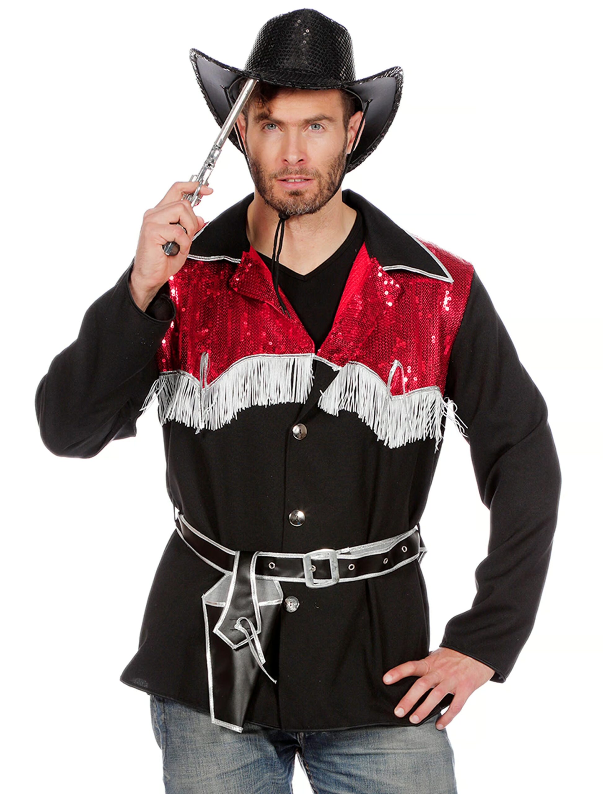 Mit dem Cowboy Hemd mit Gürtel kannst Du auf der nächsten Party den Wilden Westen unsicher machen. Das Outfit in den Farben Schwarz, Weiß und Rot eignet sich ideal, um eine Cowboyparty oder einen Karnevalszug unsicher zu machen. Dazu passt ein schicker Cowboy Hut, mit dem Du durch die Prärie reiten kannst. Auch ein passender Colt darf zu diesem Look nicht fehlen. Das Kostüm aus Polyester lässt sich beim Feiern sehr angenehm tragen. Die Pailletten und Fransen runden das Wild Wild West Outfit gut ab.