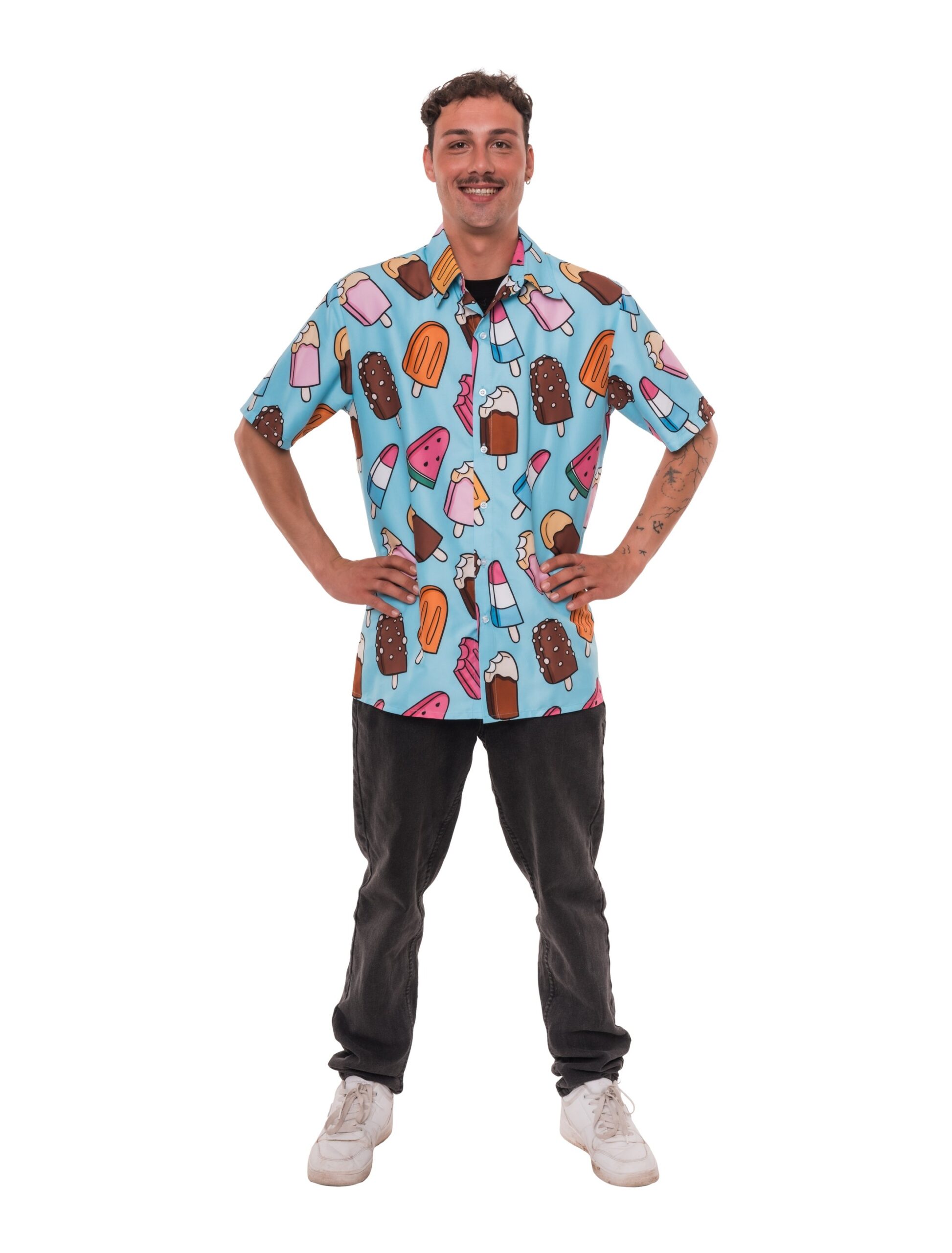 Unser Hemd Eis am Stiel für Herren ist die süßeste Art, den Sommer zu feiern. Das kurzärmelige Hemd lässt sich vorne mit mehreren Knöpfen schließen und ist über und über mit bunten Eissorten am Stiel bedruckt. Ein witziges Muster, das sofort gute Laune macht und Lust auf Sonne, Strand und Spaß verbreitet. Ob Karneval, Sommerparty oder Festival – mit unserem Eis am Stiel Hemd bist du garantiert der coolste Hingucker!